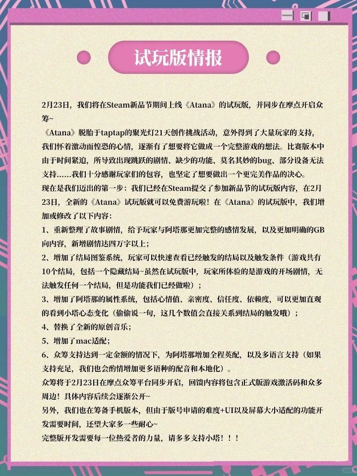 聚光灯21天游戏创作挑战的评选结果出来啦!十分荣幸拿到PC人气第一评选结束后,我们已经火速更新了移动端的游戏包,调整了文本大小(因为很多姐妹说字太小了看不清),解决了部分设置bug~《Atana》的正式版也在紧锣密鼓的筹备中,预计将于26年2月的steam新品节上线试玩版,并同步开启众筹,届时还请大家多多支持~大家的宝贵意见我们已经收到,在正式版中,将修改/补充以下内容:1.