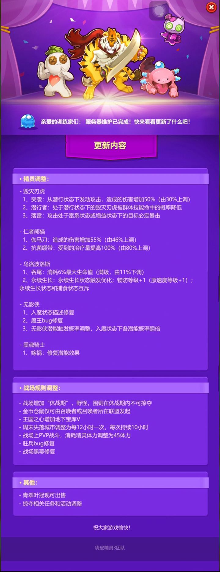宠物调整和战场规则调整