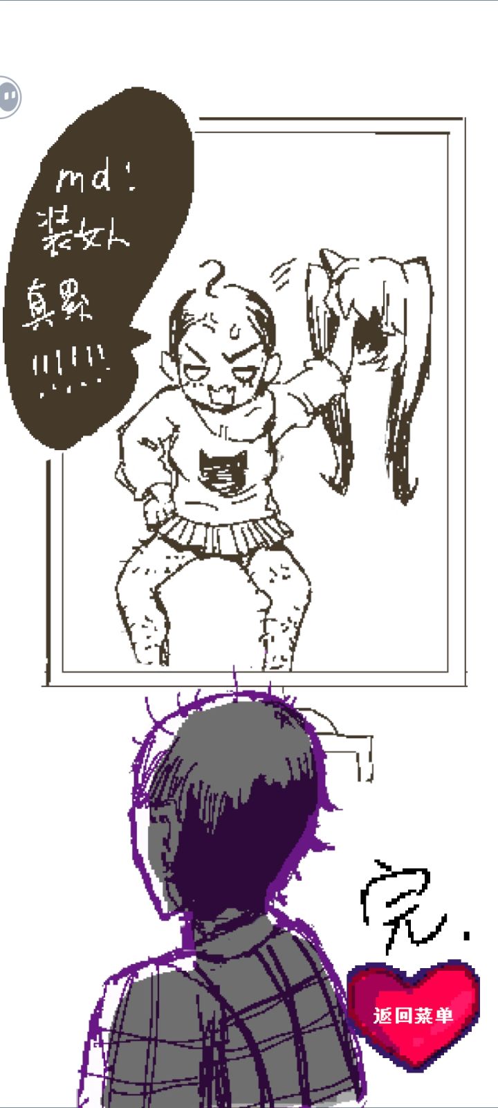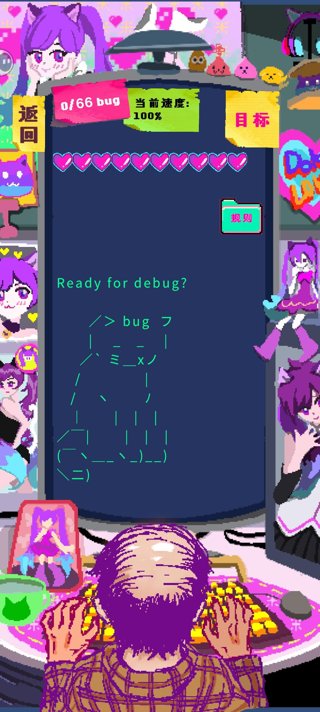 一口气玩了两遍,才发现用来第二次是直接通关了,我还想怎么好像跳了什么呢,现在终于想起来回看,也终于知道原因了。 原来这个游戏的通关,一种是时间到了,点击BUG在一定数量就可以通关了,还有一种就是点击BUG的数量达到66个就可以直接通关,就是可能会有点跳跃感,都可以到达男娘结局🤔 #单机游戏 #发现好游戏 #游戏日常 #程序员做梦会梦见电子美少女吗