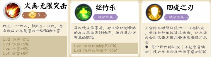 定位:多段攻击;单体输出【侠岚特性】少年昆吾有着不亚于太极侠岚的S级的攻击属性,同时少年昆吾有着全侠岚里最高多段伤害的技能(前提欧皇)。在大招打出6段左右时,少年昆吾的单体伤害系数就会大于所有侠岚系数,并且附带6次攻击判定,最高打出8段的大招甚至可以秒杀敌方任意一个脆皮。少年昆吾的一技能与大多侠岚都不一样,虽然造成的总伤害是100%,但是是分为两次攻击造成的伤害,每次伤害为攻击的50%。这个