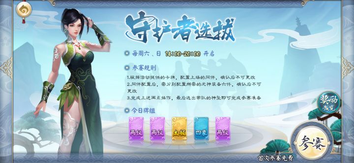 本期,游不动给大家讲讲,咱们《画江湖之侠岚》同名手游的独创玩法—守护者选拔。守护者选拔在侠岚动漫里面,可是个非常隆重的选拔比赛,这是决定着谁能够获得守护神坠的资格的一场比赛。当然了,在咱们手游中,守护者选拔这个系统玩法,难度也是很高的!不仅考验玩家朋友们对手游中侠岚的熟悉程度,也在考验大家是否具备足够的策略阵容组合能力。【守护者选拔】活动时间:每周六日 14:00-20:00开始参赛规则