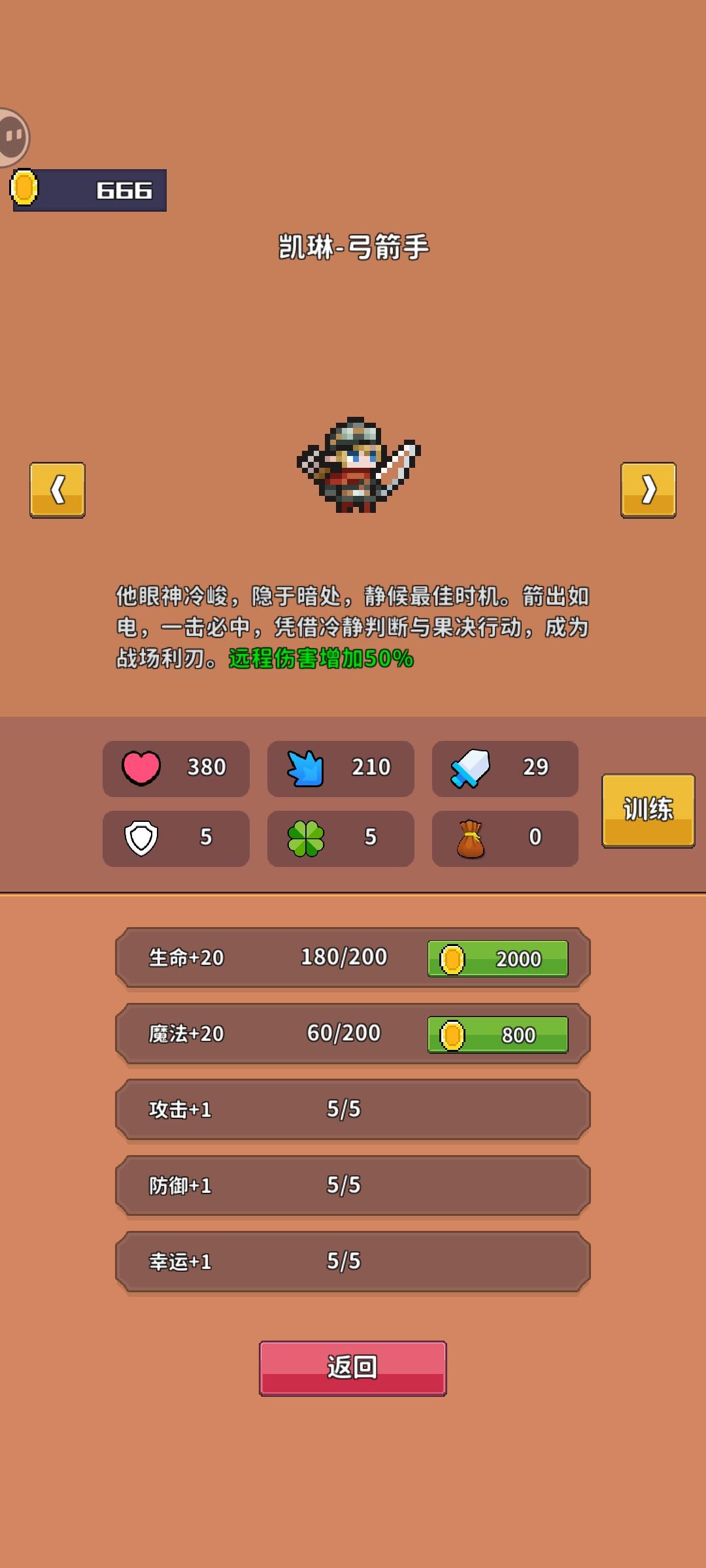 有外围养成,可以针对不同英雄强化其基础属性,英雄种类有五种,除默认角色外,其他暂未解锁。消耗关卡产出金币,可以对英雄的血、蓝、攻防和幸运进行强化,所需金币逐渐增多,是单机或轻度游戏的数值结构,养成深度较浅。