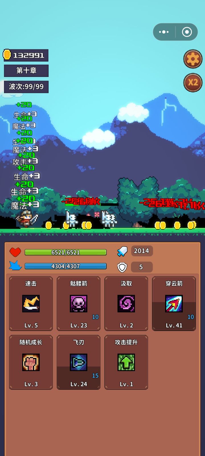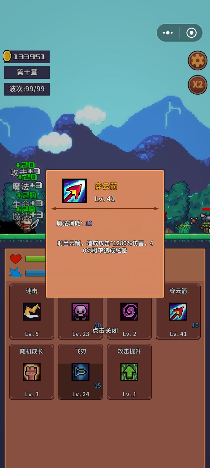 前期不好打,但买了射手就到后期了,前期法师打第三关(第四关打不过),输了也加钱,死了也不用太担心,打到一万金币买射手,加点防御>攻击>幸运先点这三个,然后那俩个随便,射手第十关关第一波先点个伤害,第二波点骷髅,然后就可以按我第二个图配了(汲取,飞刃,帮手不用点),打完之后给法师加满点,法师第十关第一波点骷髅,没有骷髅点任意伤害技,第二关必点骷髅(史莱姆也行),没有就打不了,点完之后有两个流派,一个