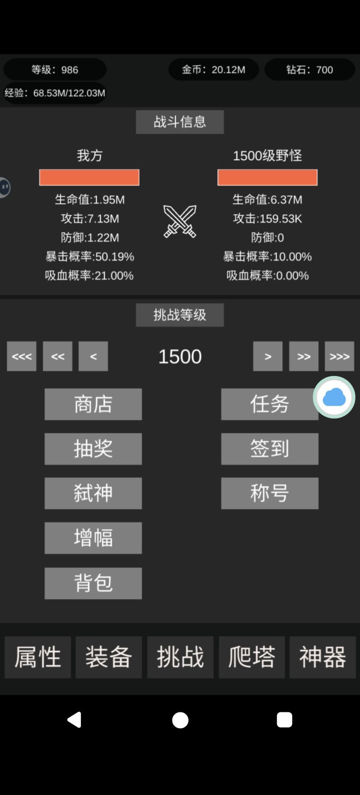 挂机世界:目标是一刀9991、游戏共5种属性:生命,攻击,防御,暴击,吸血。2、挑战等级:暂时没达到上限,但不超过自身等级1000级(但实际可超越很多)。挑战等级无法输入数字,只能1级,10级,100级的加或减,很麻烦。3、商店:分为金币,钻石,广告。4、抽奖:快速或得材料的方式。5、弑神:提升朱雀(生命)青龙(攻击)玄武(防御)相应属性,需要消耗相应材料。6、增幅:提升生命和攻击属性