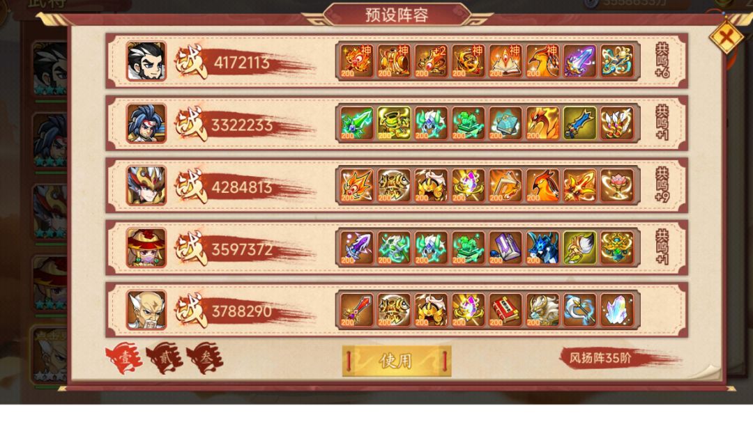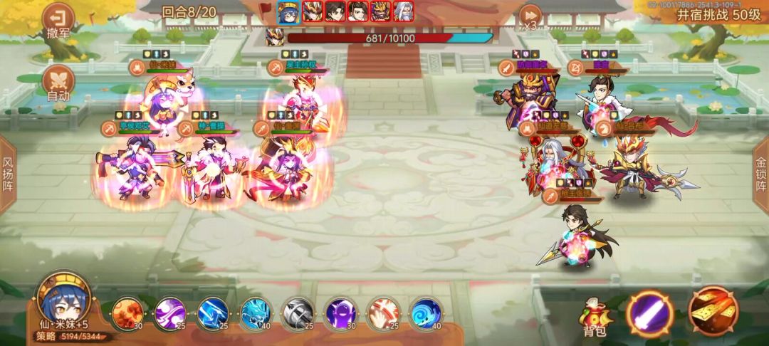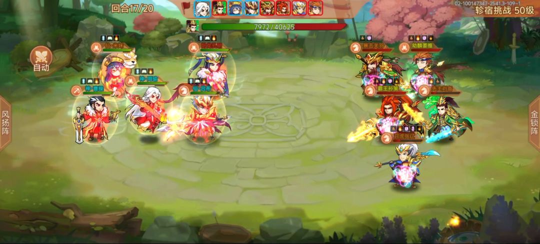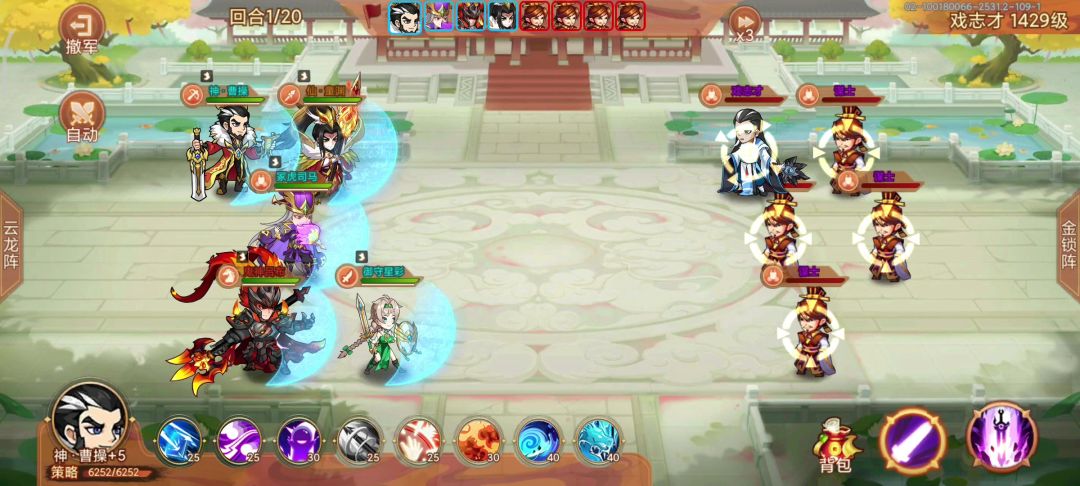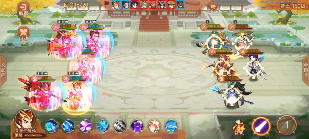 配置: 神曹,共鸣+4,3级天赋,带未启灵的琴。三星牢布,共鸣+5,带+9鞭子。童渊,带+5的剑。孙权,带印。星彩带启灵鞋子。 细节: 三个辅助放前面。牢布不能被放逐,被放逐到了直接退。有条件可以5个都超速曹丕,我是星彩开大后,童渊,曹操,孙权这三个超速。牢布尾速看情况,阵亡了就拉人,无阵亡情况的话,炮驾点月英。 我是,童渊前10回合有大点大,没大点飞镖。从第十一回合开始,奇数回合用飞镖,偶
