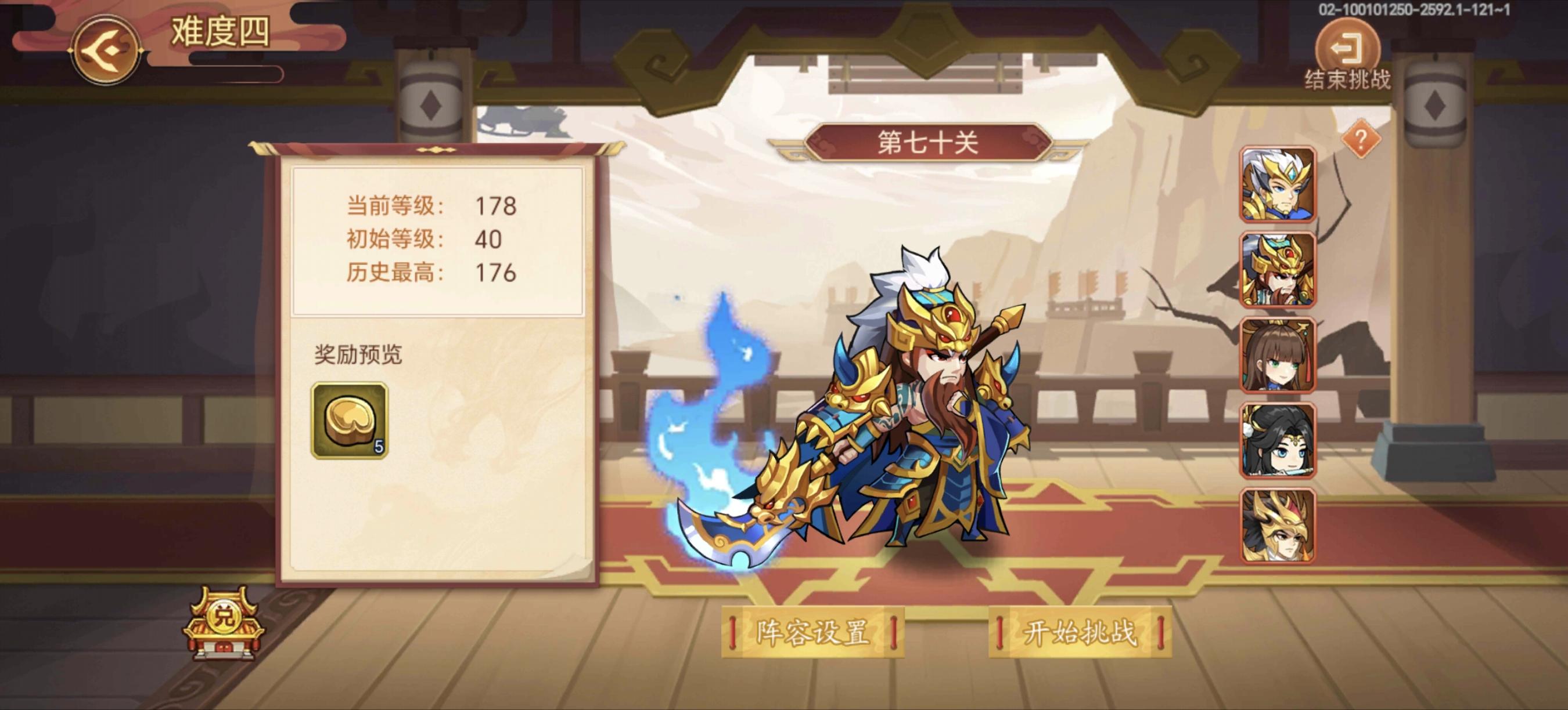 听说这关平民想过非崆峒+4以上不可过,好家伙,就这就这?只要输出足够,一切命中和控制,皆可刷脸。 队伍配置:星彩月英孙权米妹童渊【出手速度也是这样配置】 神器配置:逐日崆峒伏羲女娲轩辕【鞋子最好启灵,崆峒建议启灵+4,其它三件建议启灵+5】 阵法配置:如果有启灵鞋子也许可以尝试其它传说阵法,没有的话,风扬阵即可。 过关难点:对面免疫星彩,平民的米妹没有无视,辅助没有强制降防,导致输出乏力刮痧。 过