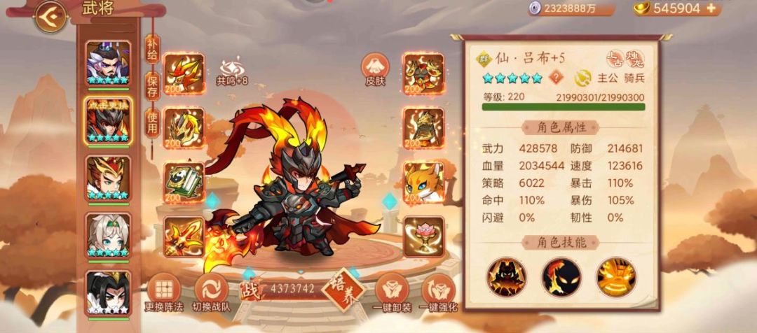 共鸣,仙吕布+8,满神曹+7,邓艾+4。用云龙阵刷不过去,后面容易死就会差一点点。换了个阵生存率飙升(31云垂),刷几次就过了。出手顺序星彩(逐日)、邓艾(壶)、神曹(伏羲)、童渊(轩辕)、仙吕布(青莲),仙吕布暴击越高越好。神器全部只要+5。第一回合星彩,邓艾开大,神曹冰龙,神曹速度只要超过童渊即可,攻击无所谓最好低点,保证第19回合还没杀死文鸳。童渊吕布普攻前排。第二回合星彩神曹给仙吕布喂酒,