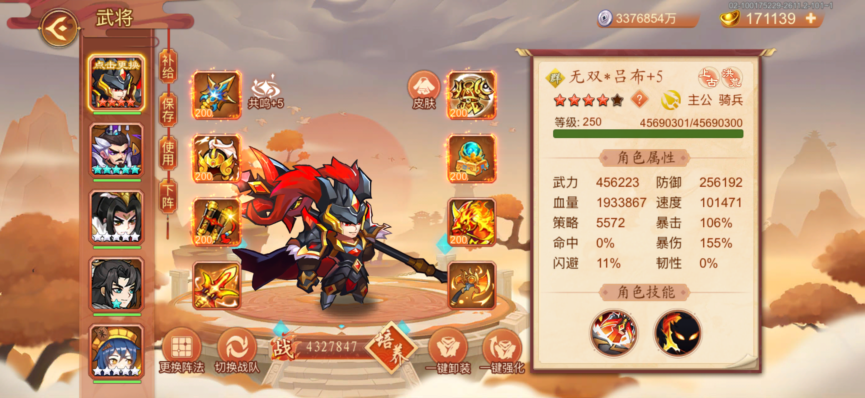 首先组建队伍,平民队伍星彩、神曹、神周、邓艾、吕玲绮,额外防御星彩100%,额外速度神星彩91%、邓艾91%、专属10%,共192%,额外血量橙色卷轴50%(平民不会有人去点韬略的血量吧?)。按照我的吕布属性比照,防御算20万,速度算16万,血量按200万算,转化一下,防御20*100%*0.6=12,速度14*192%*0.6=16.128,血量200*50%*0.3=30,共转化出武力12