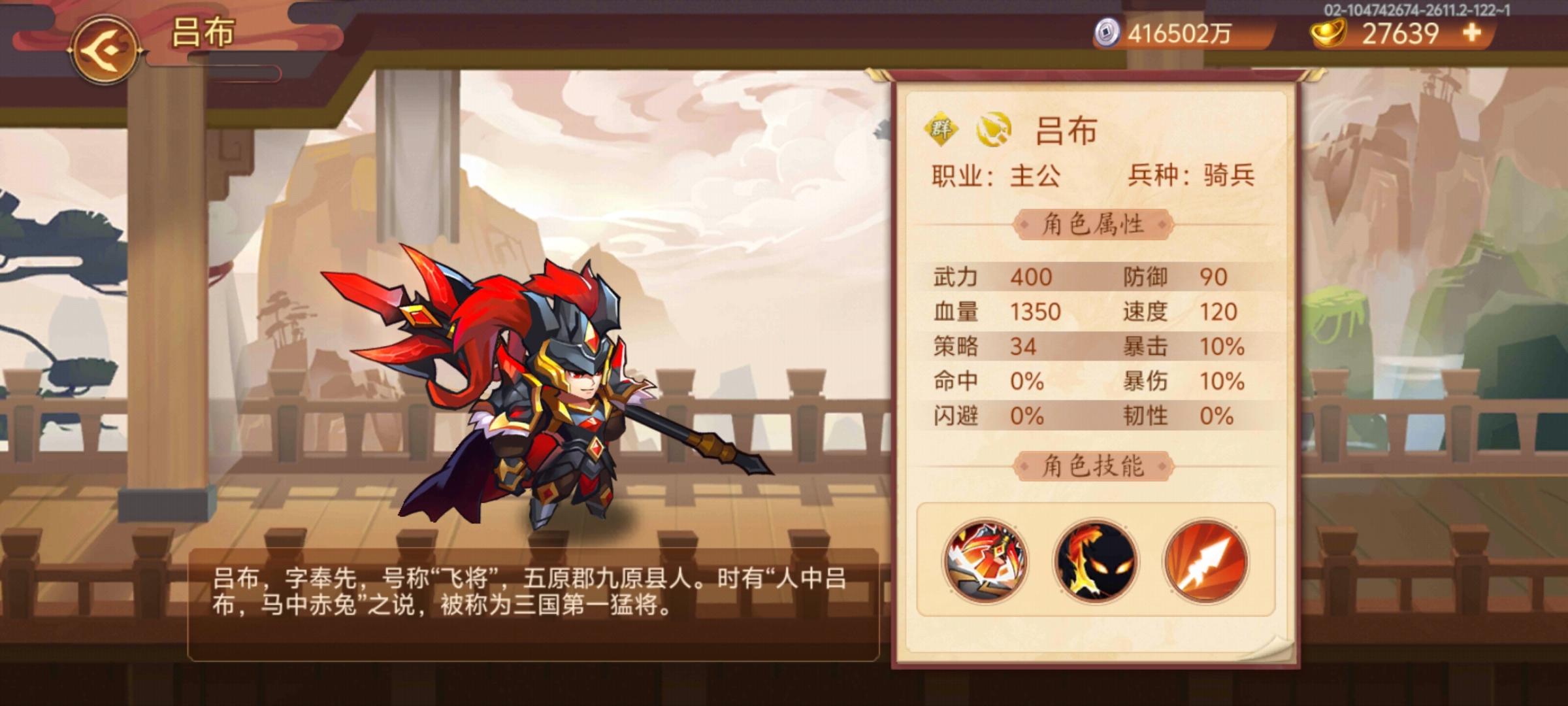 首先组建队伍,平民队伍星彩、神曹、神周、邓艾、吕玲绮,额外防御星彩100%,额外速度神星彩91%、邓艾91%、专属10%,共192%,额外血量橙色卷轴50%(平民不会有人去点韬略的血量吧?)。按照我的吕布属性比照,防御算20万,速度算16万,血量按200万算,转化一下,防御20*100%*0.6=12,速度14*192%*0.6=16.128,血量200*50%*0.3=30,共转化出武力12