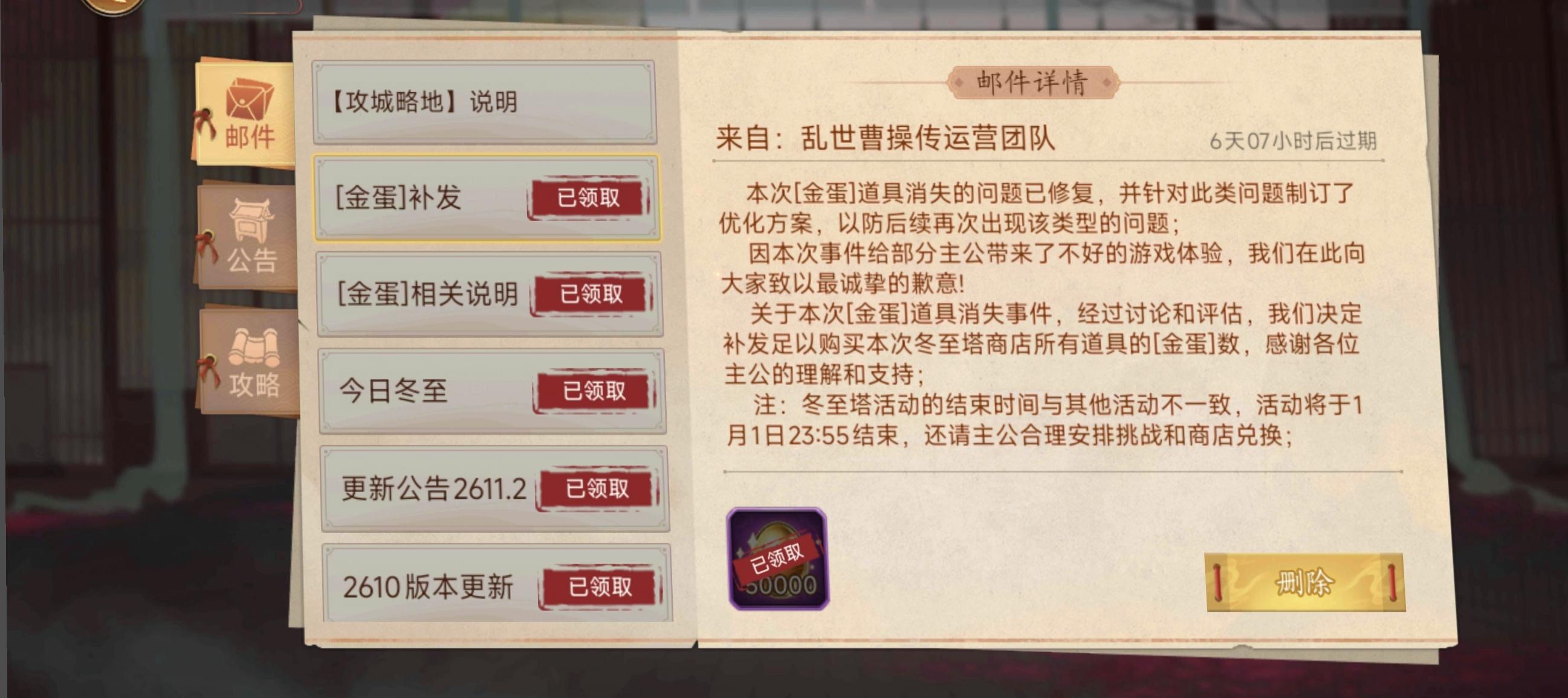 怎么金蛋这周就删除了,活动没结束,道具删了?我记得昨天应该是有留的#乱世曹操传