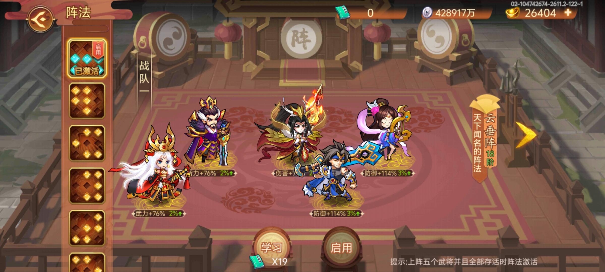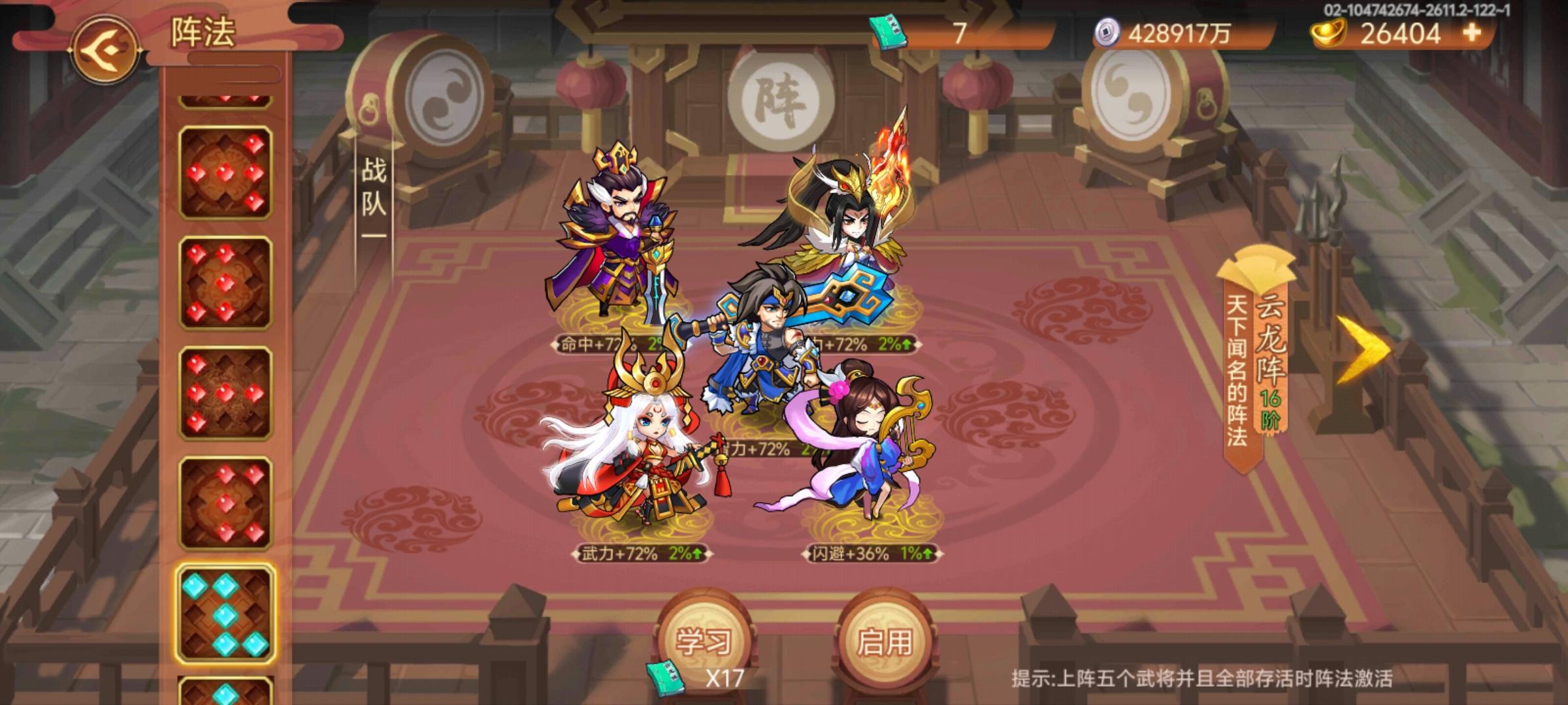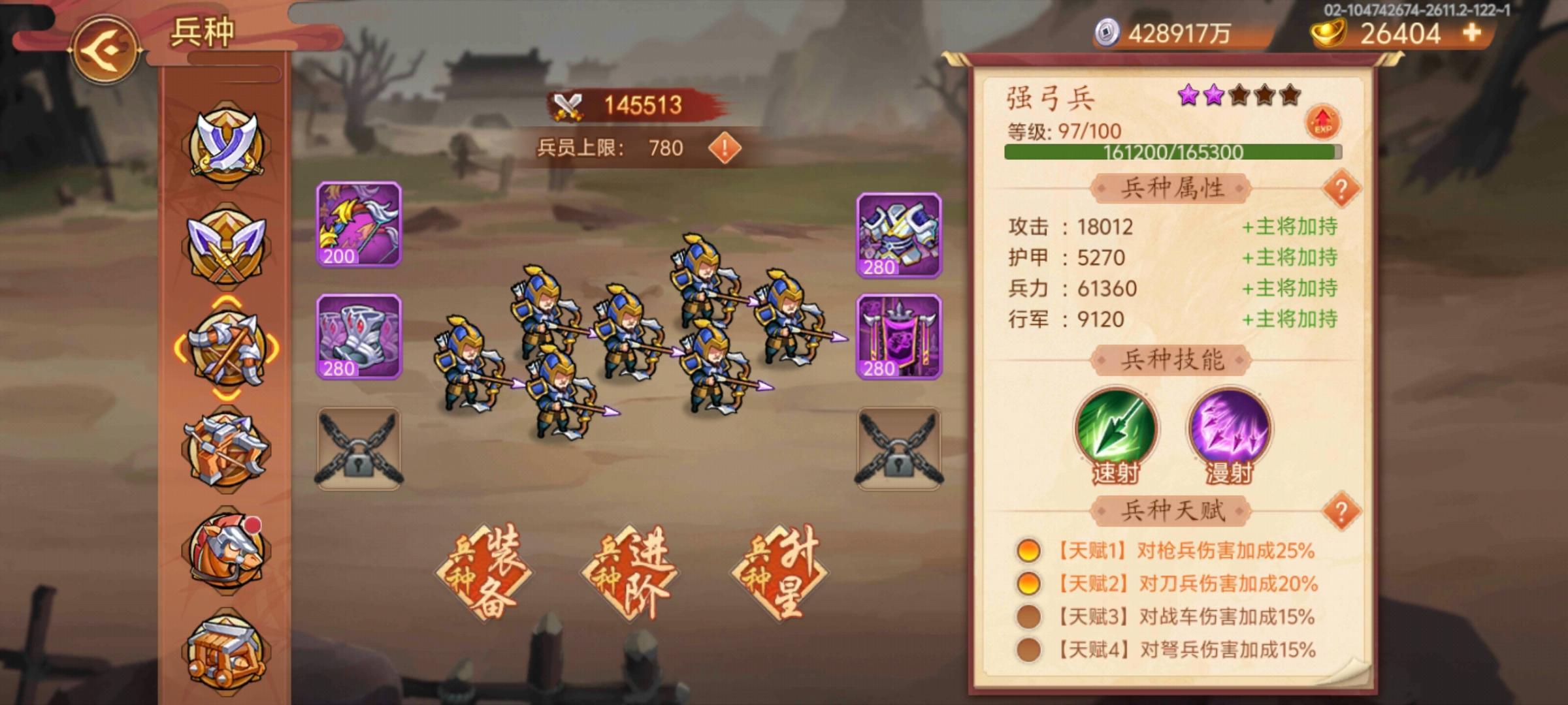 才发现云龙阵云垂阵真是好东西,云龙阵的闪避是真高,打攻城主将血厚防高打起来总是差点伤害,换了云龙云垂之后伤害翻倍一路拿下了帽子,兵种感觉没用一直没有培养太拉胯全靠骑兵硬磨,这下可以安心收菜了起码先把兵种搞上去