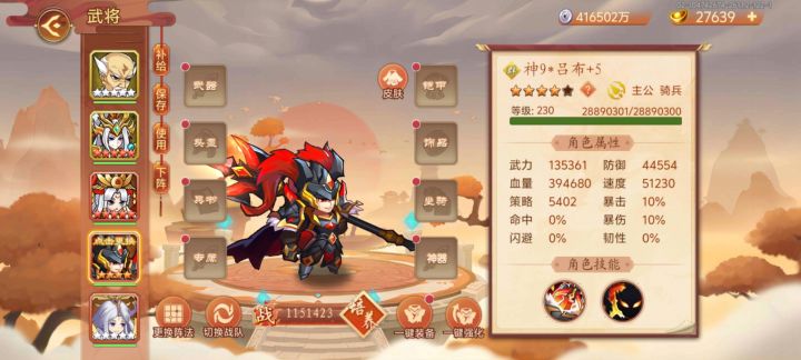 首先组建队伍,平民队伍星彩、神曹、神周、邓艾、吕玲绮,额外防御星彩100%,额外速度神星彩91%、邓艾91%、专属10%,共192%,额外血量橙色卷轴50%(平民不会有人去点韬略的血量吧?)。按照我的吕布属性比照,防御算20万,速度算16万,血量按200万算,转化一下,防御20*100%*0.6=12,速度14*192%*0.6=16.128,血量200*50%*0.3=30,共转化出武力12