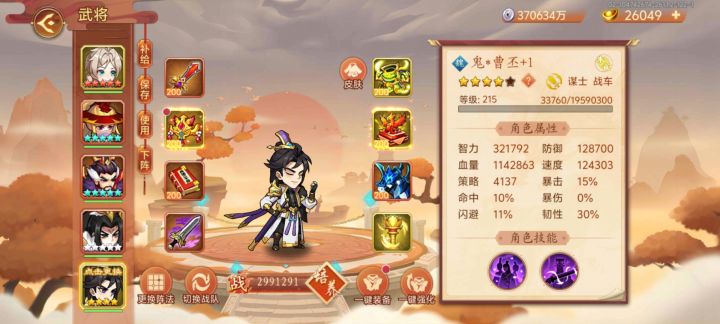首先组建队伍,平民队伍星彩、神曹、神周、邓艾、吕玲绮,额外防御星彩100%,额外速度神星彩91%、邓艾91%、专属10%,共192%,额外血量橙色卷轴50%(平民不会有人去点韬略的血量吧?)。按照我的吕布属性比照,防御算20万,速度算16万,血量按200万算,转化一下,防御20*100%*0.6=12,速度14*192%*0.6=16.128,血量200*50%*0.3=30,共转化出武力12