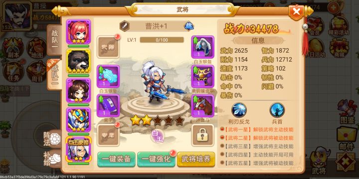首先阅读本篇攻略时,你应该对该游戏战斗机制有最基本的了解,比如速度是决定你是否能够先手的条件,这游戏能否先手有多重要我就不再说了。该游戏所有技能效果都持续2回合,该两回合并不是从你武将开始行动时开始计算,而实际是从这个回合第一速度武将行动时及开始计算。以乐进为例:第一回合乐进先手大招控住对面,控制时长为一二两回合,到第三回合乐进仍然能够先手控住,达到完美控制效果。如果乐进速度慢于对方,第一回合对方