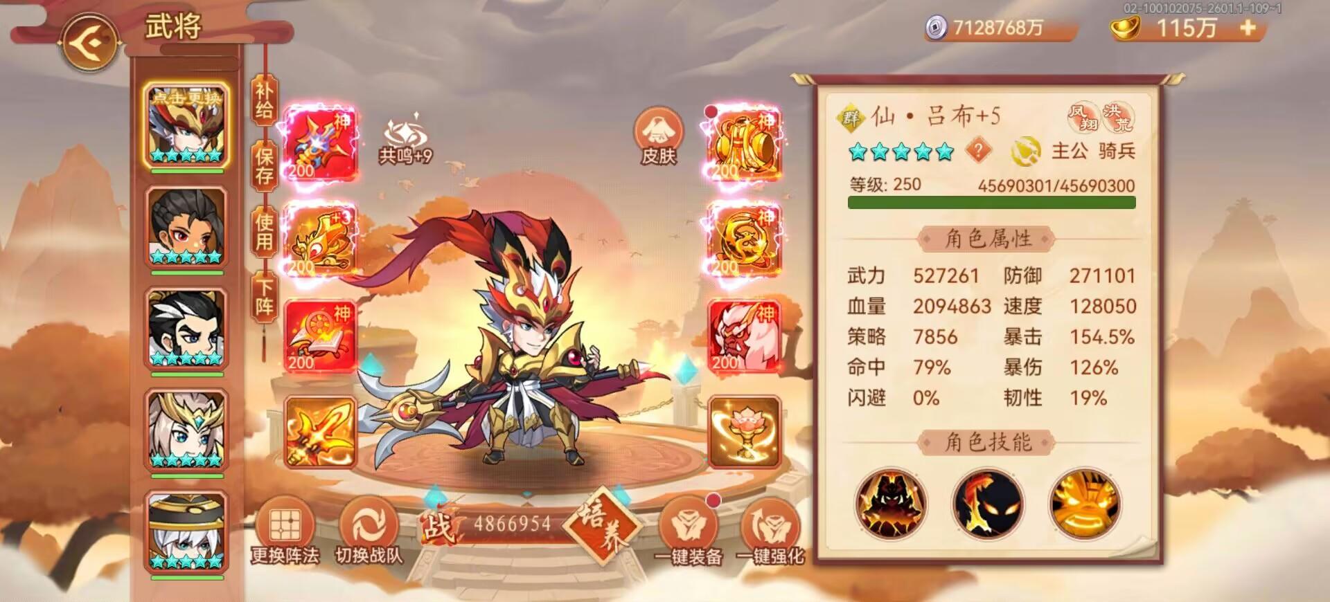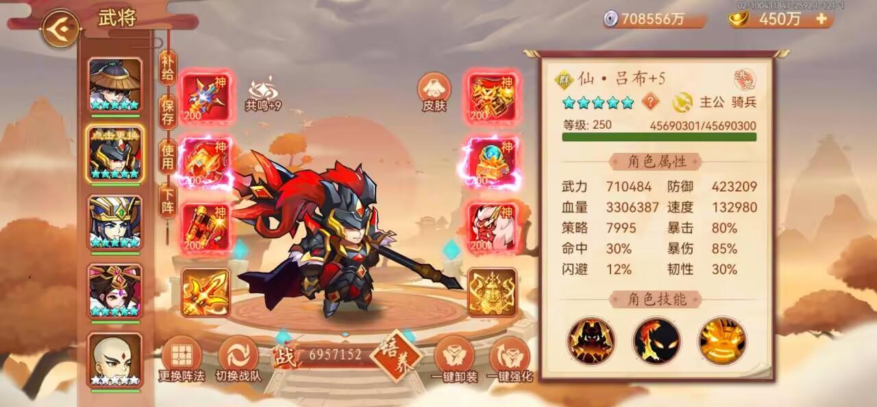 首先组建队伍,平民队伍星彩、神曹、神周、邓艾、吕玲绮,额外防御星彩100%,额外速度神星彩91%、邓艾91%、专属10%,共192%,额外血量橙色卷轴50%(平民不会有人去点韬略的血量吧?)。按照我的吕布属性比照,防御算20万,速度算16万,血量按200万算,转化一下,防御20*100%*0.6=12,速度14*192%*0.6=16.128,血量200*50%*0.3=30,共转化出武力12