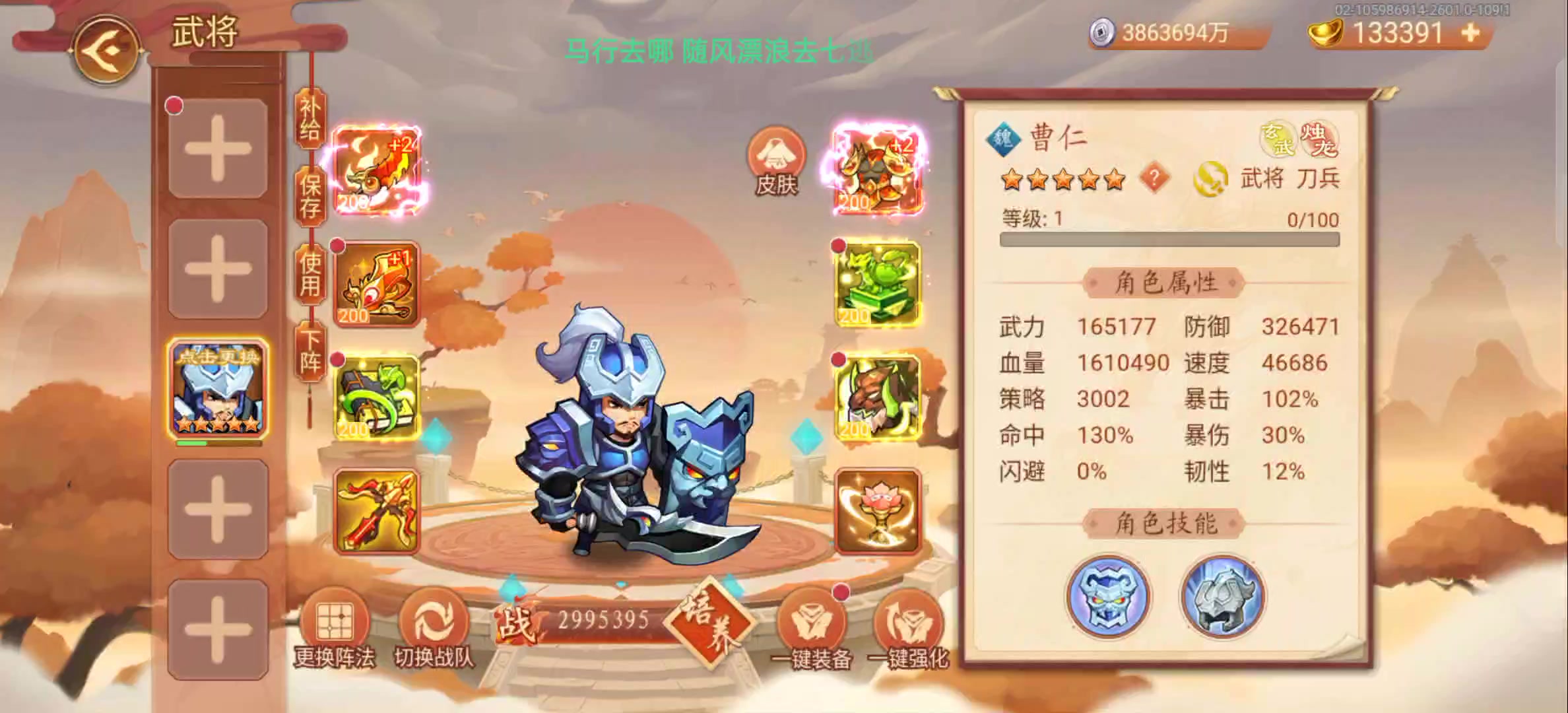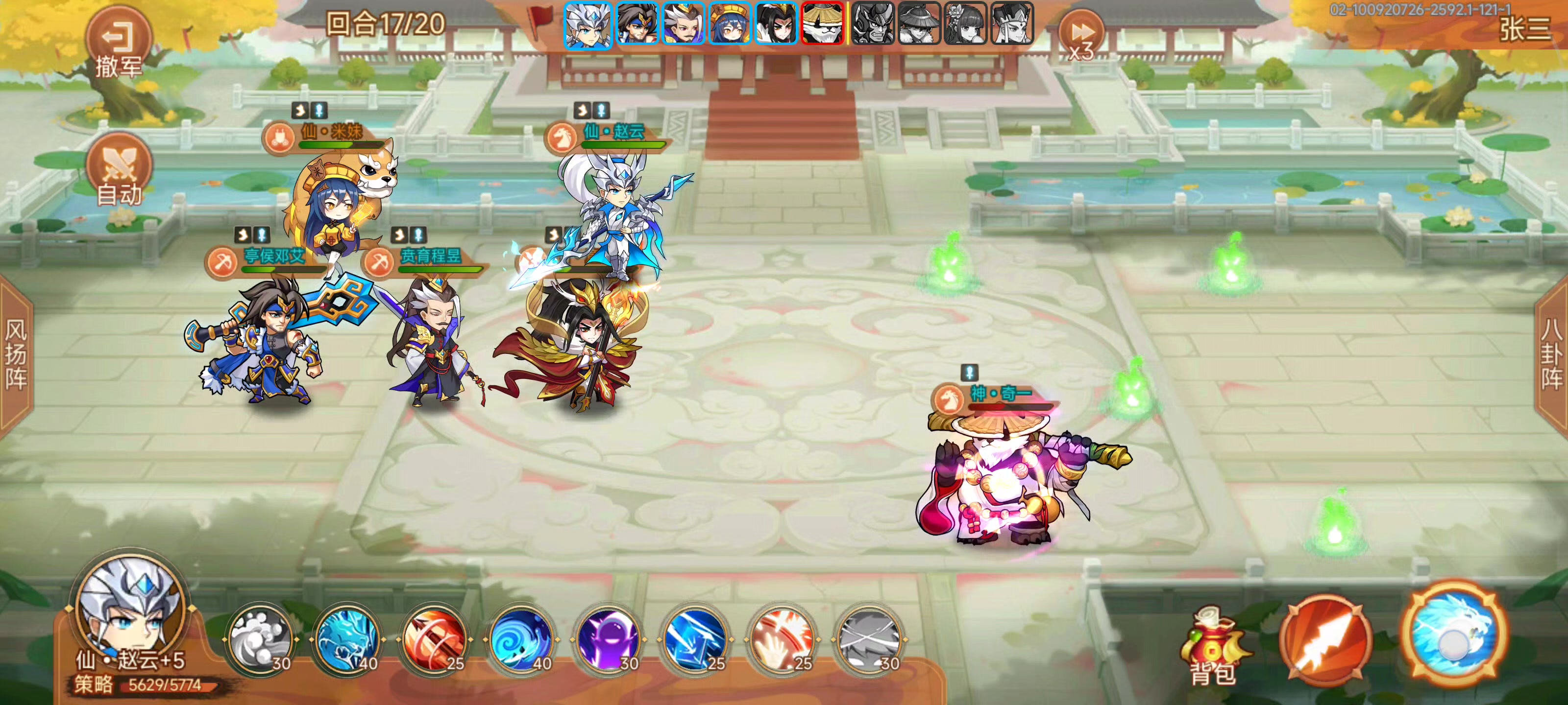 背景:白天看到“夜惜枫”起灵葫芦过吕布,我就想有没有低配版,刚好最近自己合成了一个橙色铸灵头盔,结果发现能过。 正文:需要有15个武将(无免伤增防特性)。第三个阵容需要吕布(2星即可,开共鸣,视频中➕4,我之前用赵云赌闪避是➕1),五觉孙权,伤害将(童渊,典韦),然后随便补两个。 次配版:金色无畏头盔铸灵,给五觉曹操,然后配合觉醒典韦曹操的名刀效果,多抗一回合。 注意:视频中八卦等级33阶,由于不