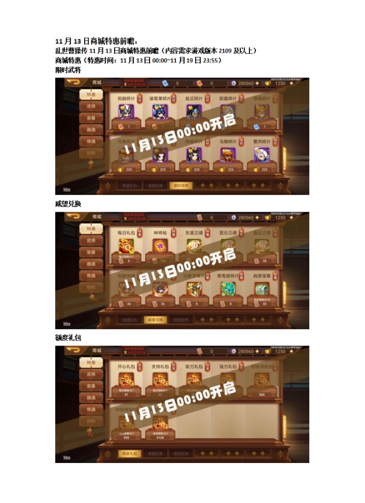 乱世曹操传11月6日普通活动前瞻预览(活动需求游戏版本2109及以上)重要提示:声望会在本期活动结束时清零,请主公及时使用,避免造成不必要的损失 月度签到(活动时间:11月6日00:00~12月6日23:59)商城特惠(活动时间:11月6日00:00~11月12日23:55)限时武将荣耀兑换额度礼包