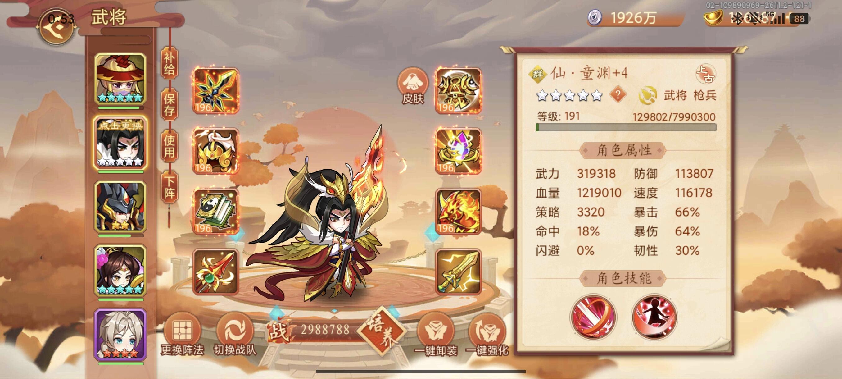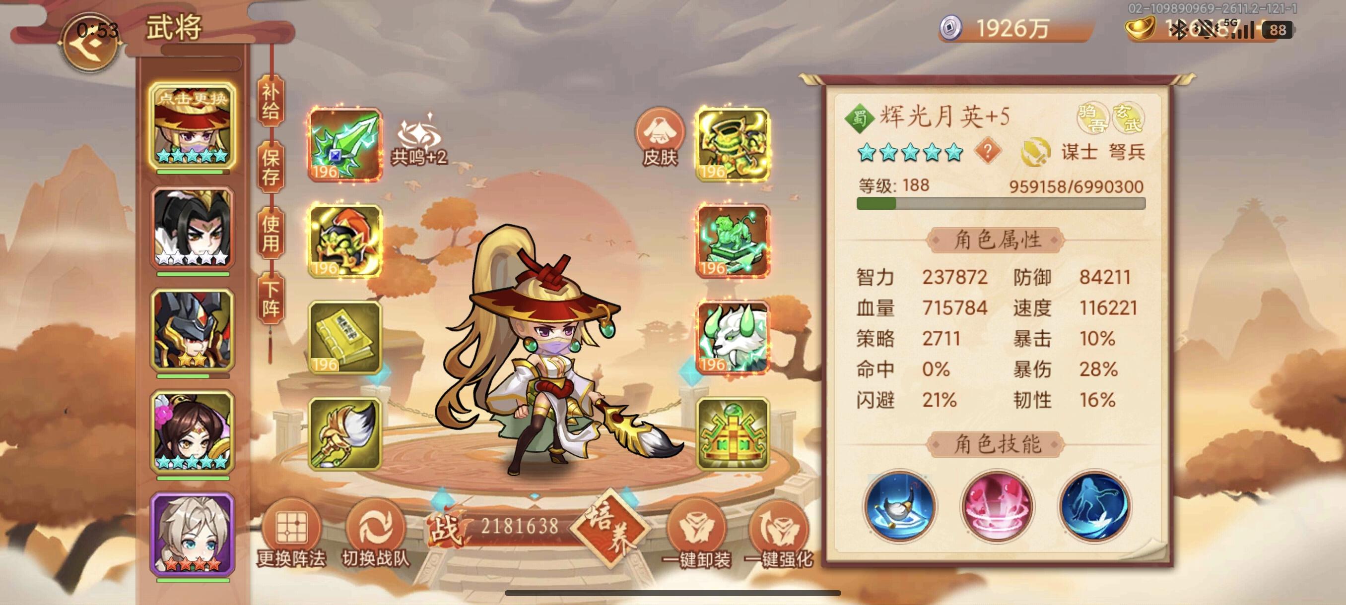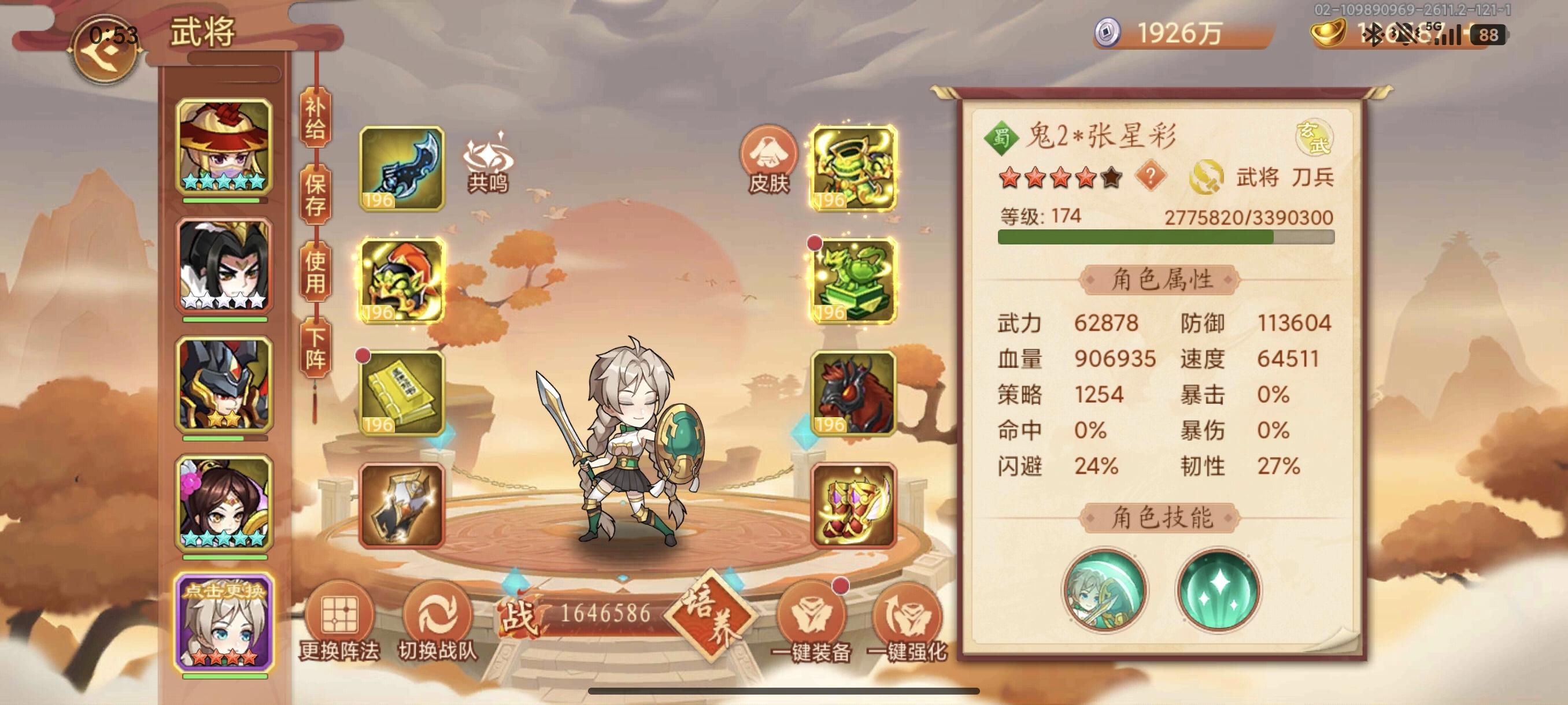 首先组建队伍,平民队伍星彩、神曹、神周、邓艾、吕玲绮,额外防御星彩100%,额外速度神星彩91%、邓艾91%、专属10%,共192%,额外血量橙色卷轴50%(平民不会有人去点韬略的血量吧?)。按照我的吕布属性比照,防御算20万,速度算16万,血量按200万算,转化一下,防御20*100%*0.6=12,速度14*192%*0.6=16.128,血量200*50%*0.3=30,共转化出武力12