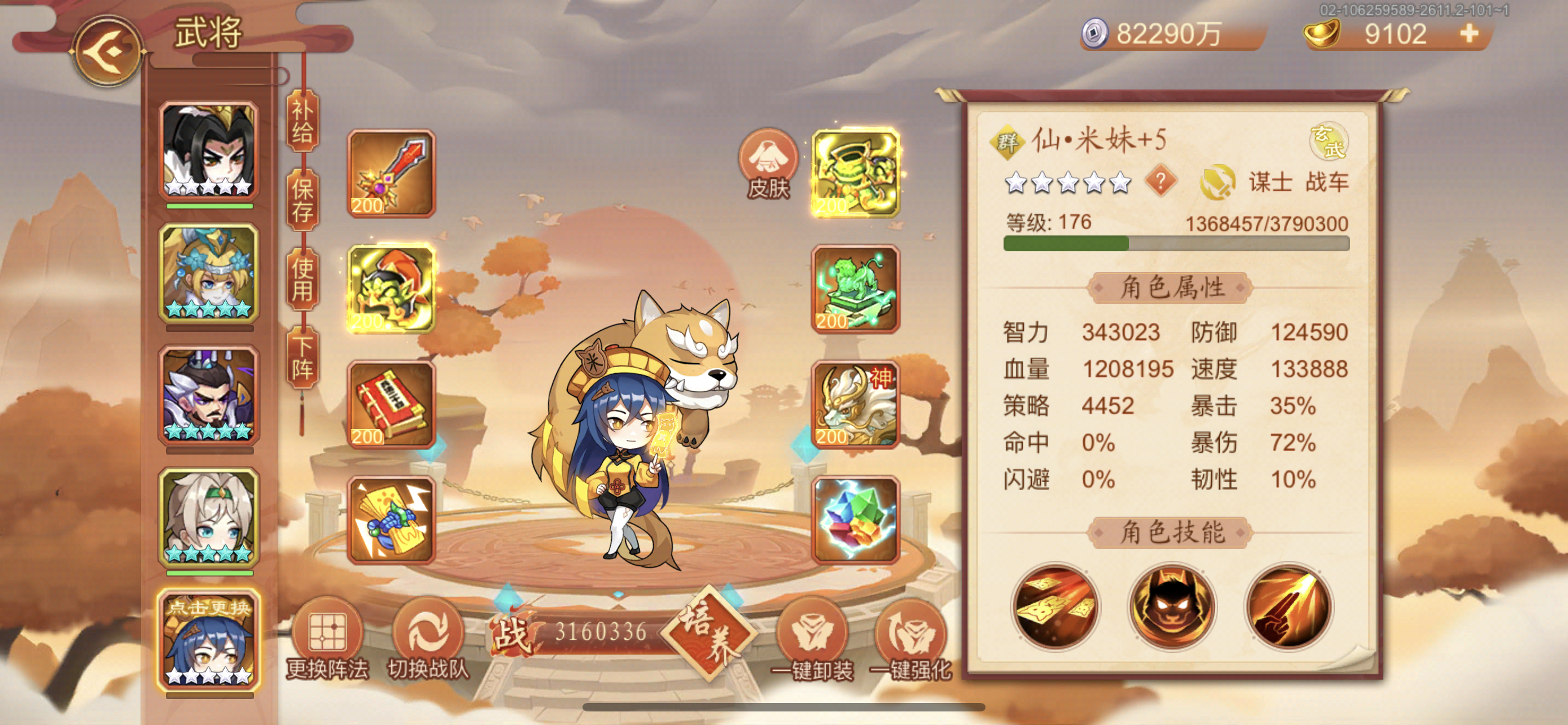 首先组建队伍,平民队伍星彩、神曹、神周、邓艾、吕玲绮,额外防御星彩100%,额外速度神星彩91%、邓艾91%、专属10%,共192%,额外血量橙色卷轴50%(平民不会有人去点韬略的血量吧?)。按照我的吕布属性比照,防御算20万,速度算16万,血量按200万算,转化一下,防御20*100%*0.6=12,速度14*192%*0.6=16.128,血量200*50%*0.3=30,共转化出武力12
