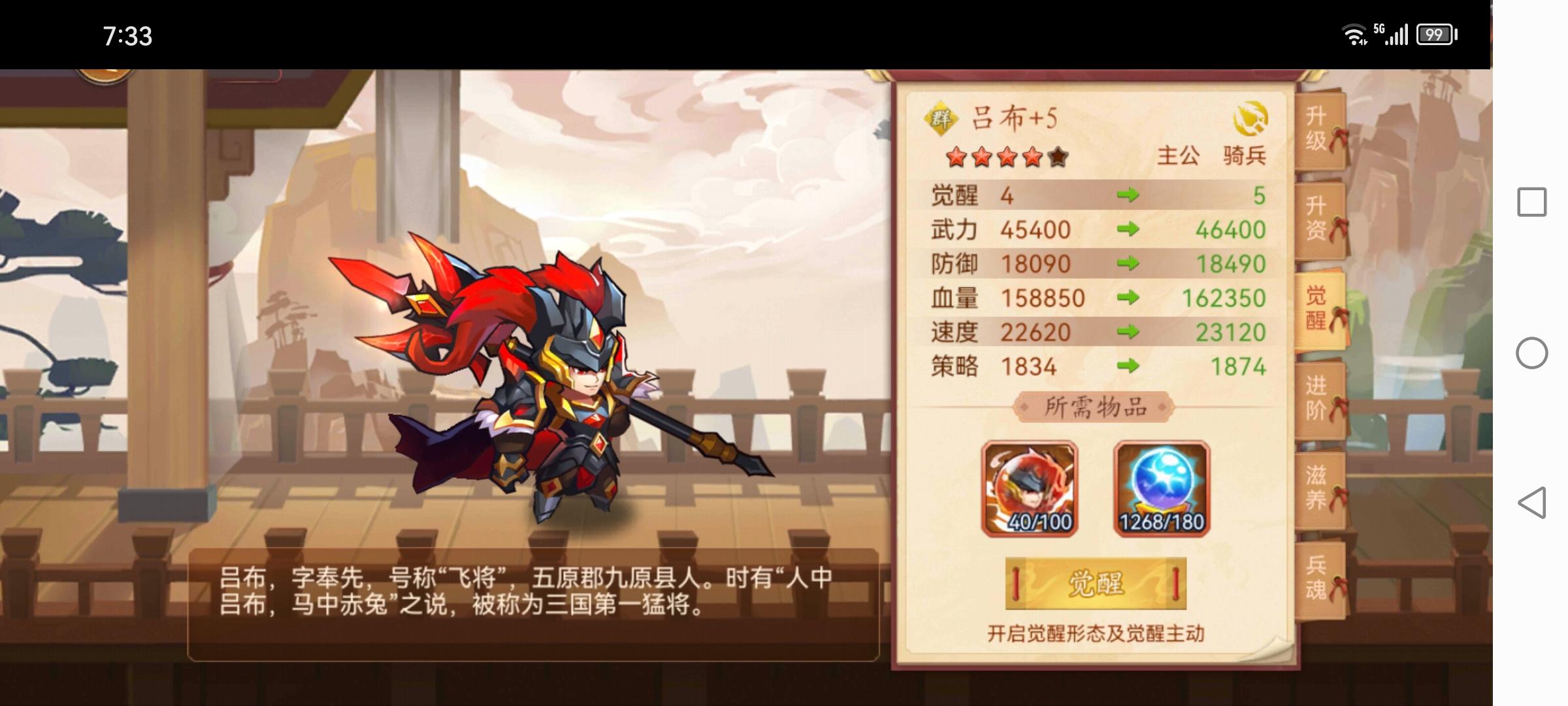 首先组建队伍,平民队伍星彩、神曹、神周、邓艾、吕玲绮,额外防御星彩100%,额外速度神星彩91%、邓艾91%、专属10%,共192%,额外血量橙色卷轴50%(平民不会有人去点韬略的血量吧?)。按照我的吕布属性比照,防御算20万,速度算16万,血量按200万算,转化一下,防御20*100%*0.6=12,速度14*192%*0.6=16.128,血量200*50%*0.3=30,共转化出武力12