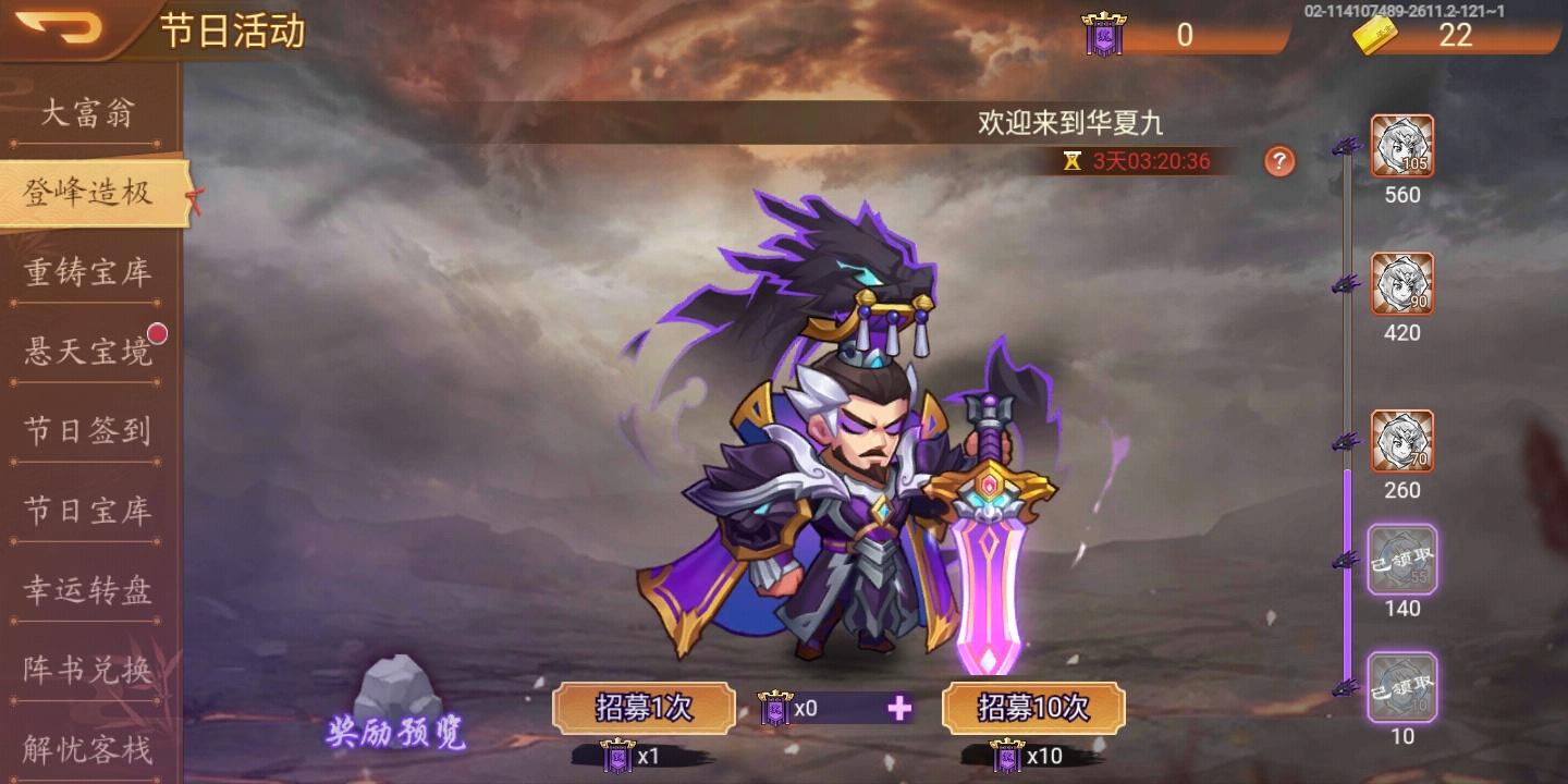 注:所有活动需更新至2.6.10及以上版本才能参加,请玩家及时更新最新版本,具体活动内容以游戏内为准。【活动1:群雄挑战】起始时间 2026-01-23 10:00:00结束时间 2026-01-30 09:50:00活动内容:活动期间开启限时副本挑战,活动副本共有7层,每层4关,每次过关可获得奖励。每日解锁一层可进行挑战。活动奖励:刘备碎片,刘备资石,双股剑碎片。【活动2:群雄争霸】