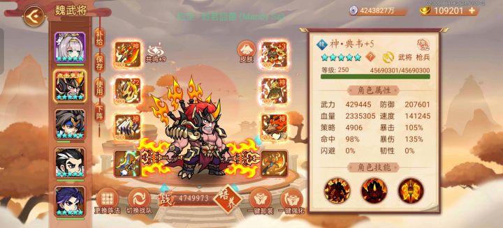 首先组建队伍,平民队伍星彩、神曹、神周、邓艾、吕玲绮,额外防御星彩100%,额外速度神星彩91%、邓艾91%、专属10%,共192%,额外血量橙色卷轴50%(平民不会有人去点韬略的血量吧?)。按照我的吕布属性比照,防御算20万,速度算16万,血量按200万算,转化一下,防御20*100%*0.6=12,速度14*192%*0.6=16.128,血量200*50%*0.3=30,共转化出武力12