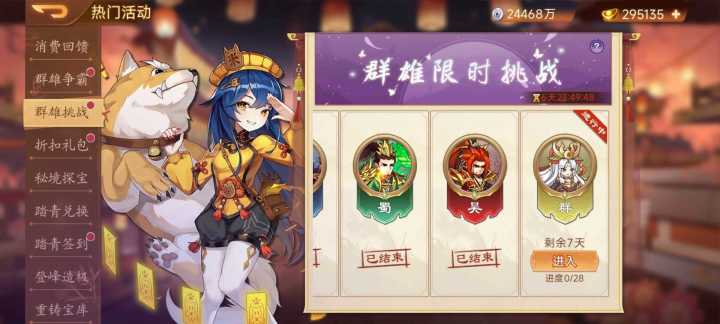 注:所有活动需更新至2.5.51及以上版本才能参加,请玩家及时更新最新版本,具体活动内容以游戏内为准。【活动1:群雄挑战】起始时间 2025-04-25 10:00:00结束时间 2025-05-09 09:50:00活动内容:活动期间开启限时副本挑战,活动副本共有7层,每层4关,每次过关可获得奖励。每日解锁一层可进行挑战。第一周活动奖励:太史慈碎片,太史慈资石,强袭弓碎片第二周活动奖