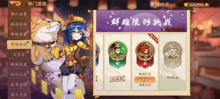 注:所有活动需更新至2.6.30及以上版本才能参加,请玩家及时更新最新版本,具体活动内容以游戏内为准。【活动1:群雄挑战】起始时间 2026-04-24 10:00:00结束时间 2026-05-01 09:55:00活动内容:活动期间开启限时副本挑战,活动副本共有7层,每层4关,每次过关可获得奖励。每日解锁一层可进行挑战。活动奖励:甘宁碎片,甘宁资石,进阶丹。【活动2:折扣礼包】起