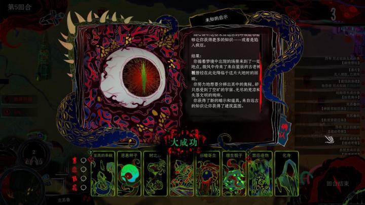 如果我们可以使用污染渗透这一类的卡牌去攻击对方阵营的建筑,污染进度达到100%之后对方的建筑就被你攻陷了。如果你攻陷的是教堂——相当于总部,那么你就把对方灭了。攻陷了其他两个阵营的教堂,就意味着你拿下了这一局,获得了胜利。如果你觉得这不够“古神”那味儿,也可以选择通过完成“成神”任务的方式来获得胜利。这个相对来说就复杂一些。