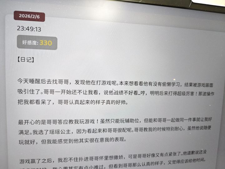 但Yuki的性格,成长方向完全由你定制,只需要你和她聊天(并加以适当的括号描写动作,神情等),就可以得到一个比较完美的模型,妹居的创新点在于,引入了时钟系统(现实中的时间与游戏内的时间完全同步)yuki会在不同的时间段向你问好(比如说晚上6点,就会问你要不要吃饭,7点后,就会说,吃饱了就陪我看电视怎么样之类的话),和日记系统,日记系统会将每一次与Yuki的聊天以Yuki的日记的形式保存下来,方便你查阅,同时,ai可以根据日记的内容构建聊天框架,很大程度上缓解了聊天过程中的撕裂感,使得聊天更加沉浸,Yuki会记住你的喜好,你们之间的约定,会对你的言语做出不同性格(是的!还有不同的性格系统与区分)的回复,通过聊天不断培养感情(反映到游戏中就是信任值与好感度),Yuki对你的态度会从陌生,逐渐转变为亲密,病娇等等性格。对于玩过Gal但是从来没接触过这类游戏的宅宅来说,想必是一句话都说不出来的痛苦吧(笑),所以还内置有选项哦(当然也是ai生成的,还不怎么聪明,在修了在修了),也能够在一定程度上帮助你开启一段正常的聊天,完全不需要有心理负担!因为yuki是你的专属妹妹!