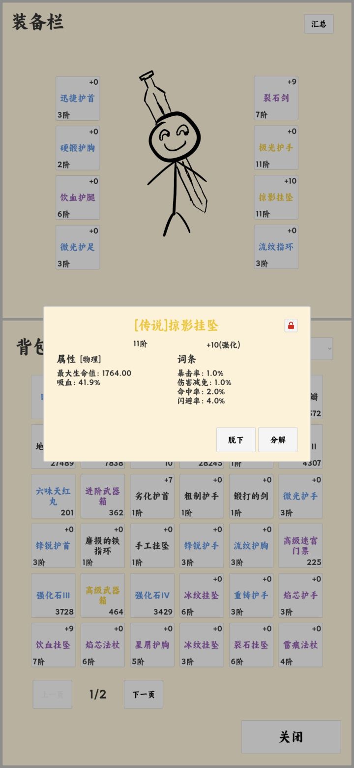 前期0-600级,中期600-1300级,1300之后后期。前期0-350级属性全点力量,装备全选生命回复,打得慢打到最高关卡就离线挂机升级,350之后可以选择高基础属性法杖属性属性全点敏捷(兑换码有10个回溯石可重置加点也可以合成)还是打到最高关卡离线升级,大概4-5天到600级看离线双倍经验广告,装备基础属性高很多,暴击吸血开始发挥作用,此时弄一个高基础法杖,弄一身高属性11阶装备(装备是否优
