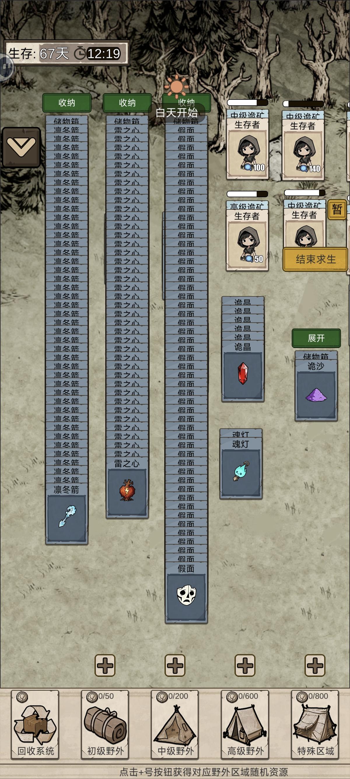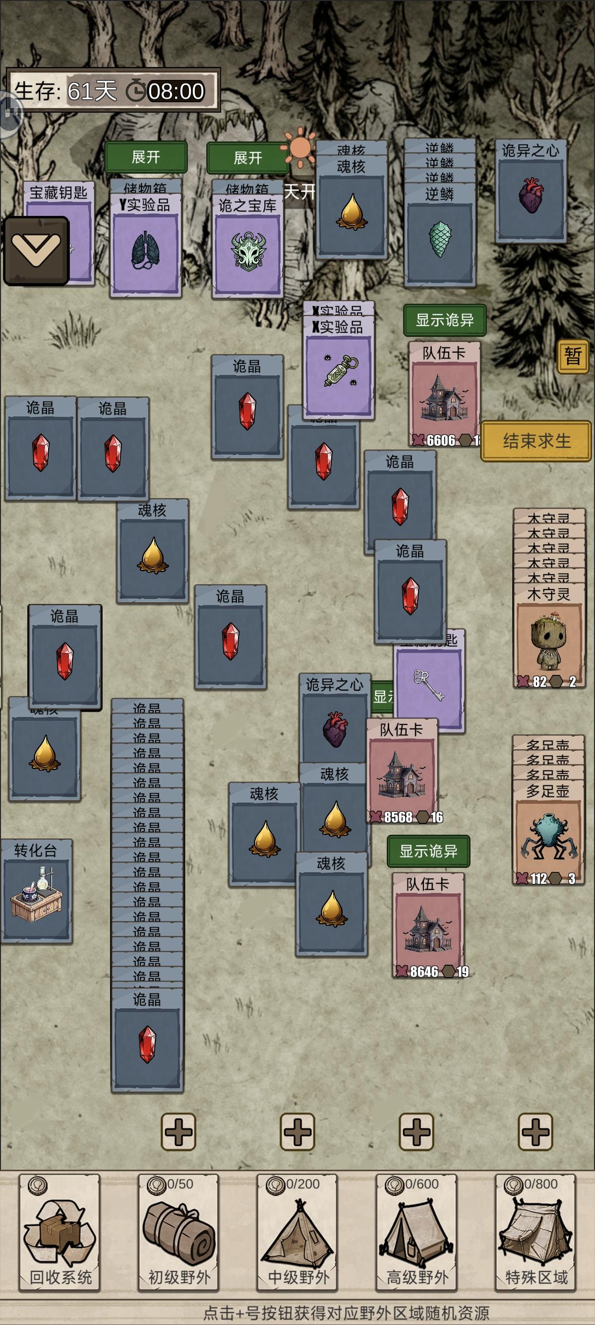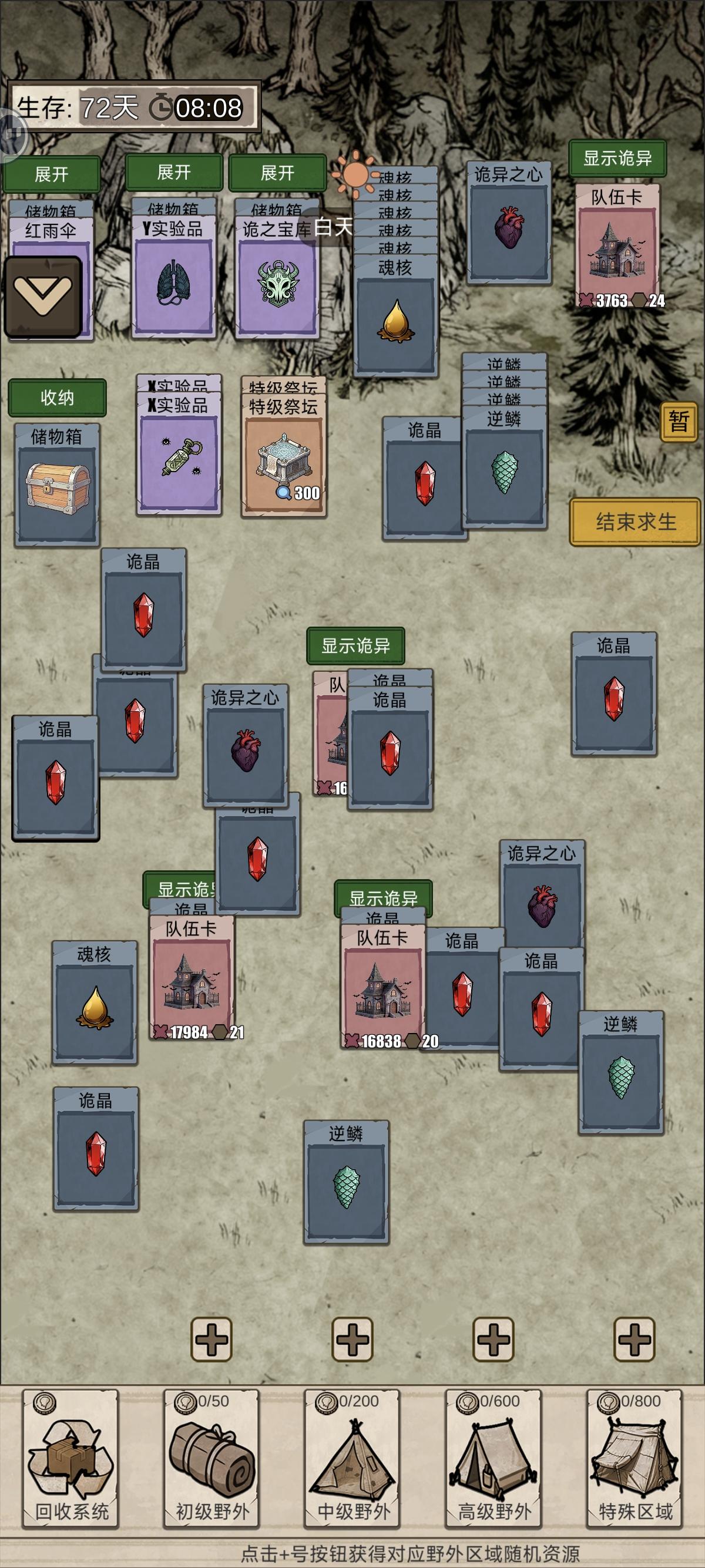 一.诡矿太占位置了二.诡晶根本就不够,刷初级野外真的刷爆了三.储物箱一个感觉不太够四.图感觉还可以再扩大一下有一次拖诡怪的时候直接回收了,二三十张直接没了。真的已经摆烂了。
