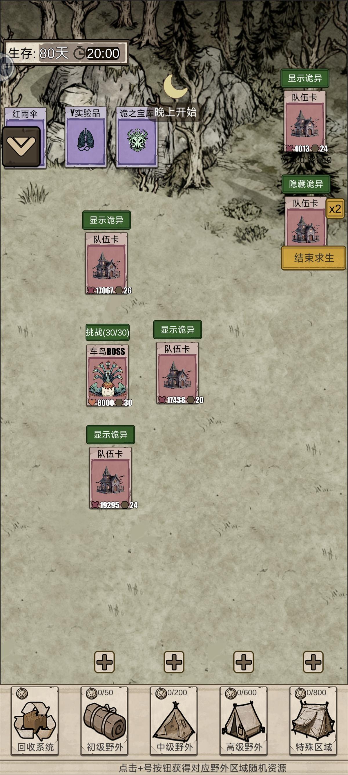 前三十天每五天怪物数值变动一次,三十天后每十天变动一次,以下数值为生命/容量。附一张最新80天通关图,17张生存者,总战力30万,欢迎大家一起晒出自己最高战力值。1-4天 一只诡怪 30/105-9天 三只诡怪 30/1010天 一只boss 300/5010-14天 三只诡怪 100/1215-19天 三只诡怪 200/2520天 一只boss 1000/5021-24天 三只诡