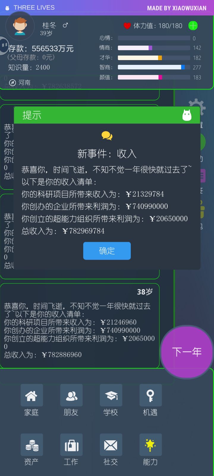 目前游戏体验快5小时,先把第一档天才档全收集了,游戏挺有趣的,喜欢模拟人生类型游戏的可以一试。不过多轮继承后明显卡顿了,现在记不清第几轮继承人,几乎一年一卡,必须退出重进,父母死亡信息每年都会重复弹一遍。