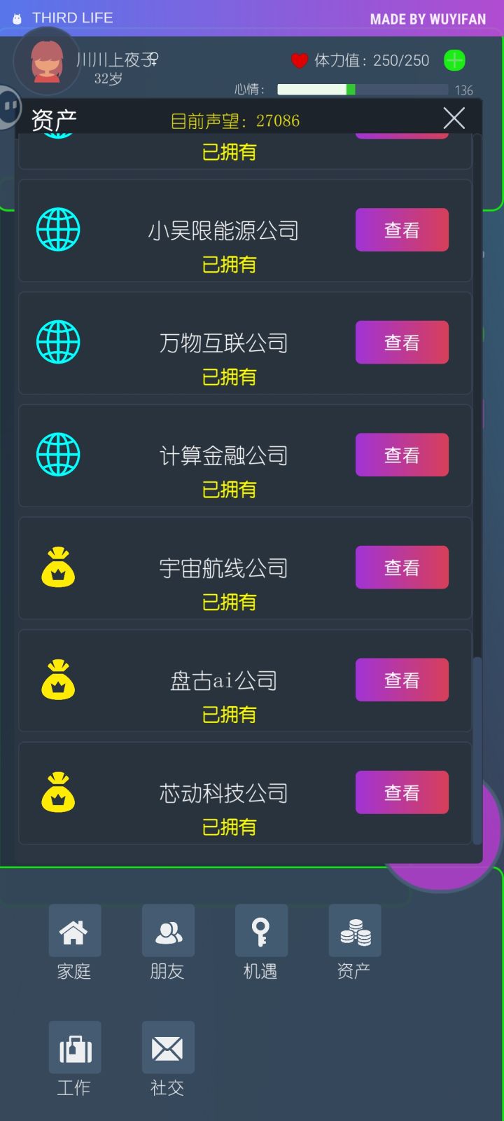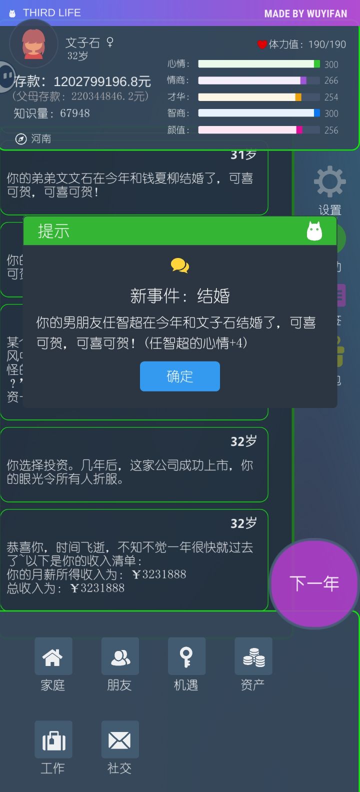 工作:前期靠刷知识量选高薪工作攒钱,后期企业开满了去神秘商店把金钱刷满也不用升职了。想上班就放着,也有五六百万左右的收入。