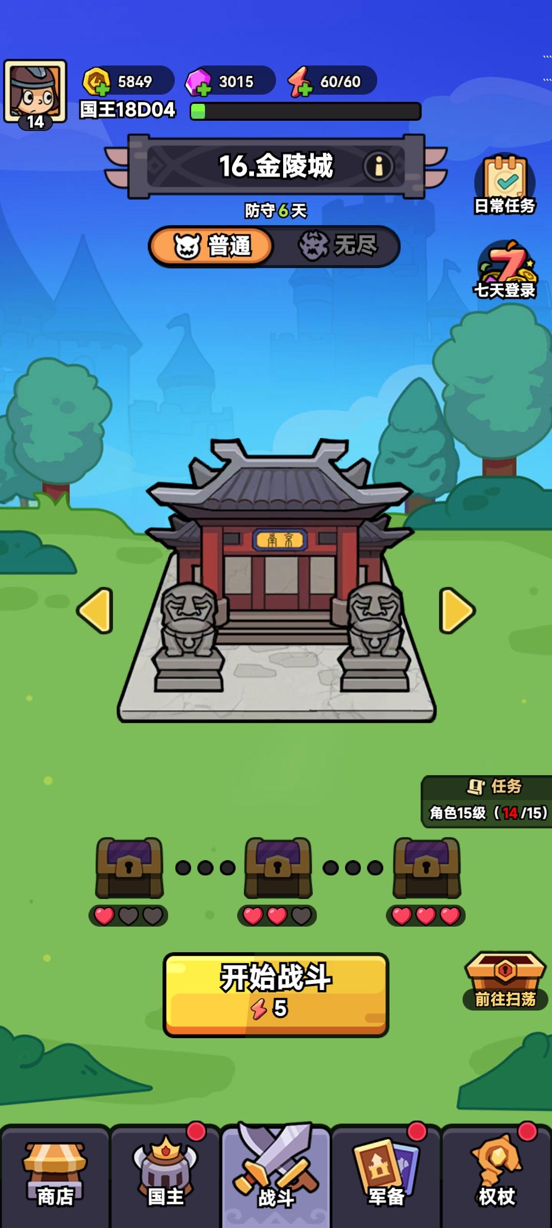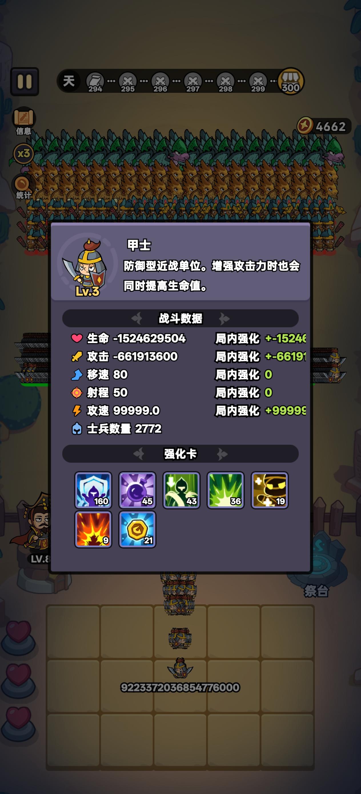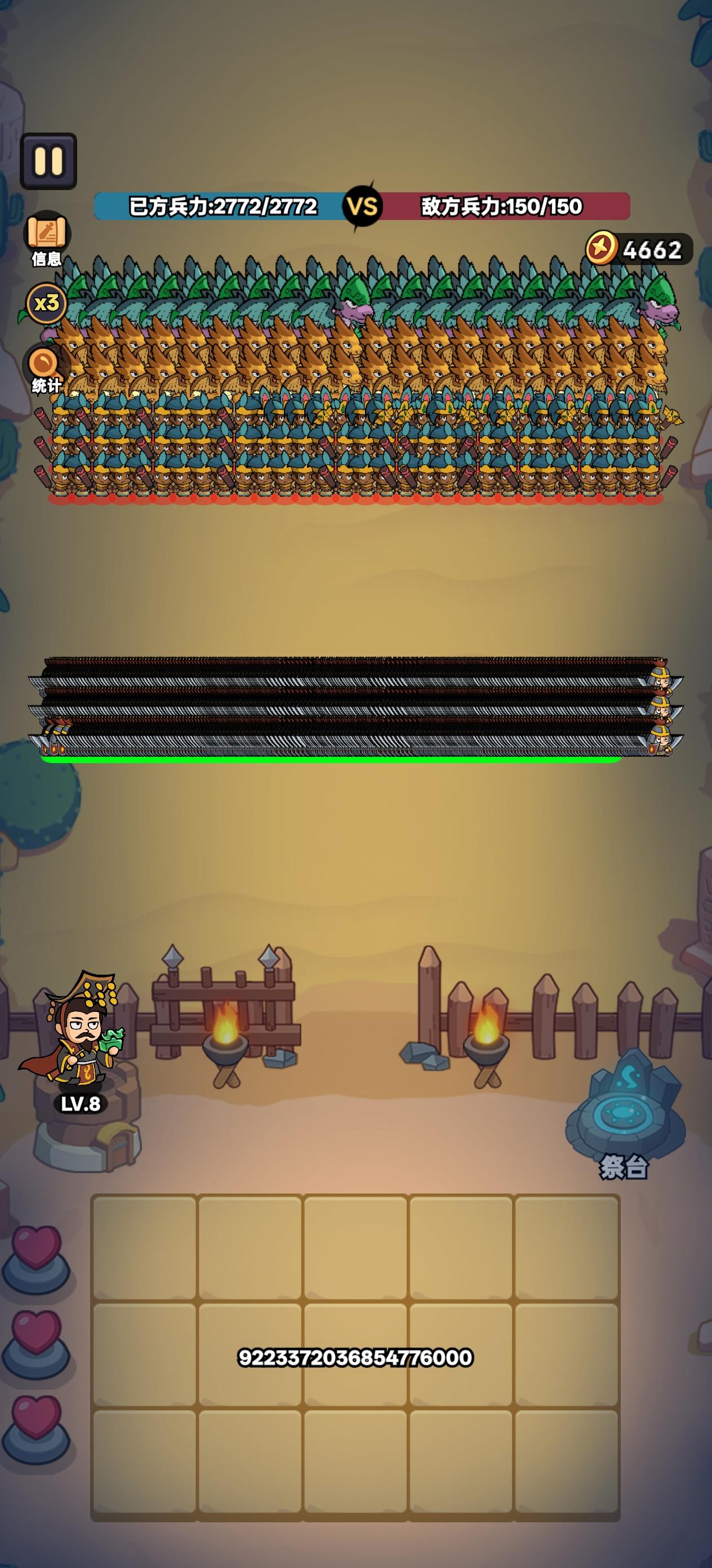 最终关卡兵忘记截图了,直接莽过去人数和对面差不多平推,后面几乎不掉人数。每次特殊的三选一刷出来1级兵翻倍,不知道升级兵种后会掉属性吗,着急肝进度没试,卡牌前期主要拿征兵数量,万能卡,复制卡,我这个是一波加九个兵,后面差不多跟对面人数一样,后面拿特性和增加特性方法的卡就行(死亡爆炸,吸血这俩很重要),主玩中间一个兵种。其他还不懂到时候现编