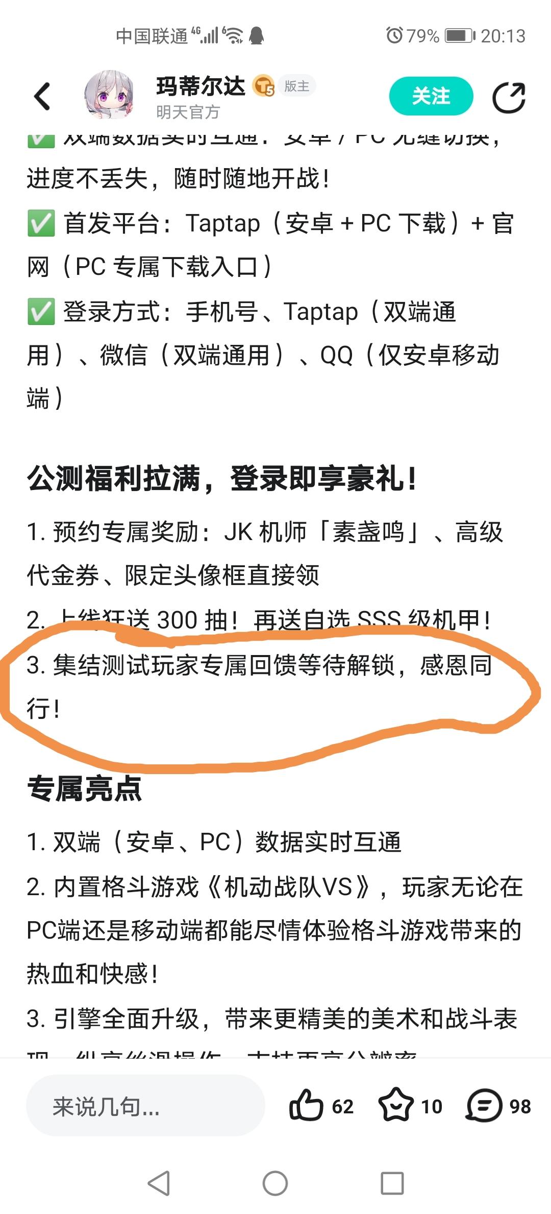 机动战队:明天公测开启!亲爱的指挥官:《明天》公测今日开启!指挥官,回味经典,机动热血回归!>>公测信息公测开服时间:1月20日公测已开服平台:安卓、PC双端开放,双端数据互通。公测专属礼包码:mingtian,指挥官可通过“系统菜单—兑换码”输入领取奖励的。🎁公测开服追加福利🎁高级代金券x10、宴会邀请函x10,更新后通过游戏内邮件发放>>下载方式指挥官可前往TapTap或官