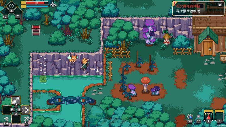 关于游戏UI方面,毕竟作为一款RPG游戏来说,其中所需要的内容元素是很丰富的,所以一般来说整个游戏界面的排版就需要有很多讲究,能感觉出制作组有花了许多心思在这上面的。简单的可以将整个界面分成四个部分,左上角显示的是我们主角所拥有的角色属性,像是基础的血量条以及魔力条等等,而左下角则是显示了主角可以快捷使用的技能,最多可以一次性装备四个技能,在战斗时灵活使用可能会产生意想不到的效果,到了右下角则是快捷使用的道具和部分功能快捷键显示,比如最经常使用的地图功能,最后右上角显示的是我们当前需要去完成的任务目标。
