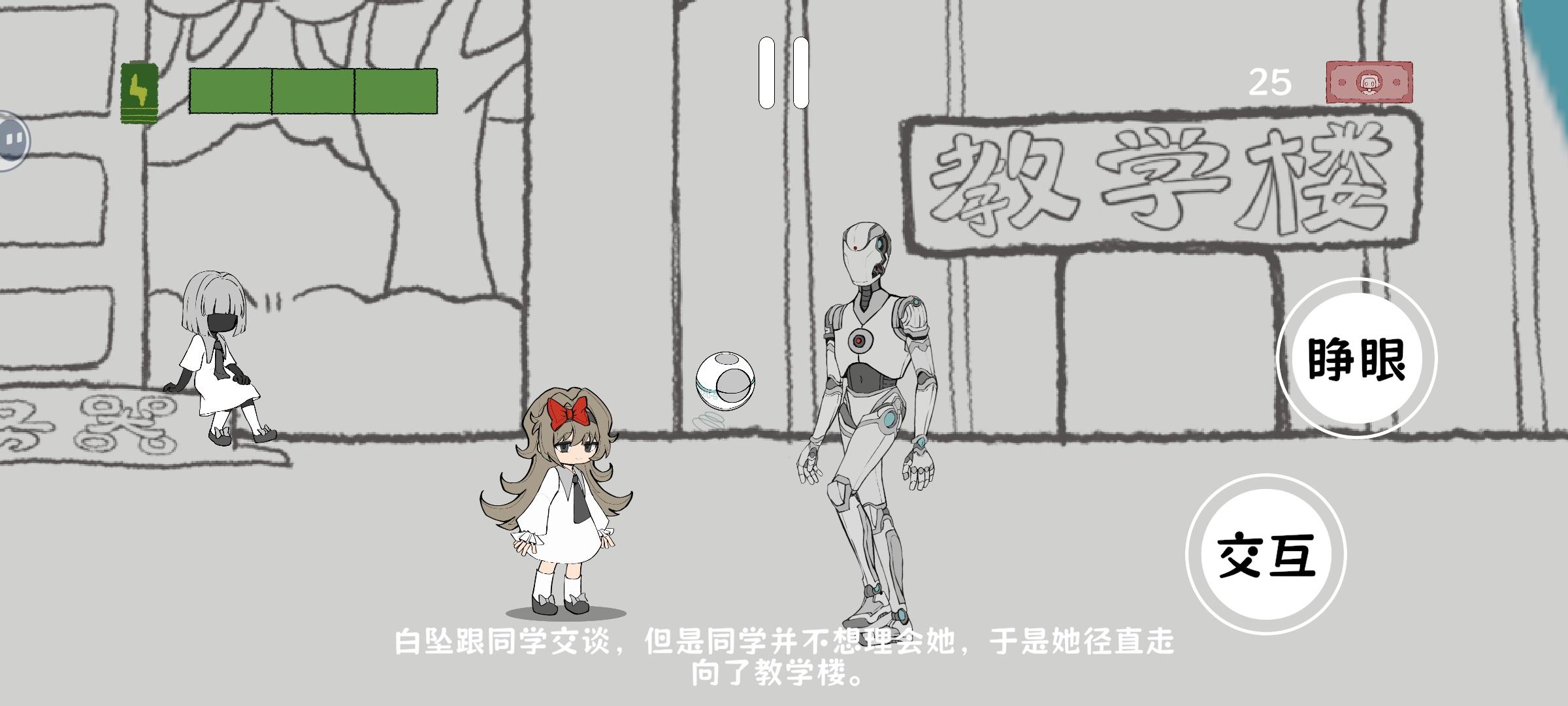 横版解谜类游戏,主角设定为未来世界的一名学生,身边的电子眼默认是闭着的,整个世界毫无色彩,仅有简单轮廓。电子眼睁开可以看到彩色世界,也会看到具体文本,感官上很新奇。交互可以与场景内角色进行交流,或者寻找到剧情物品。操作引导靠旁白来告知,上手并不难。