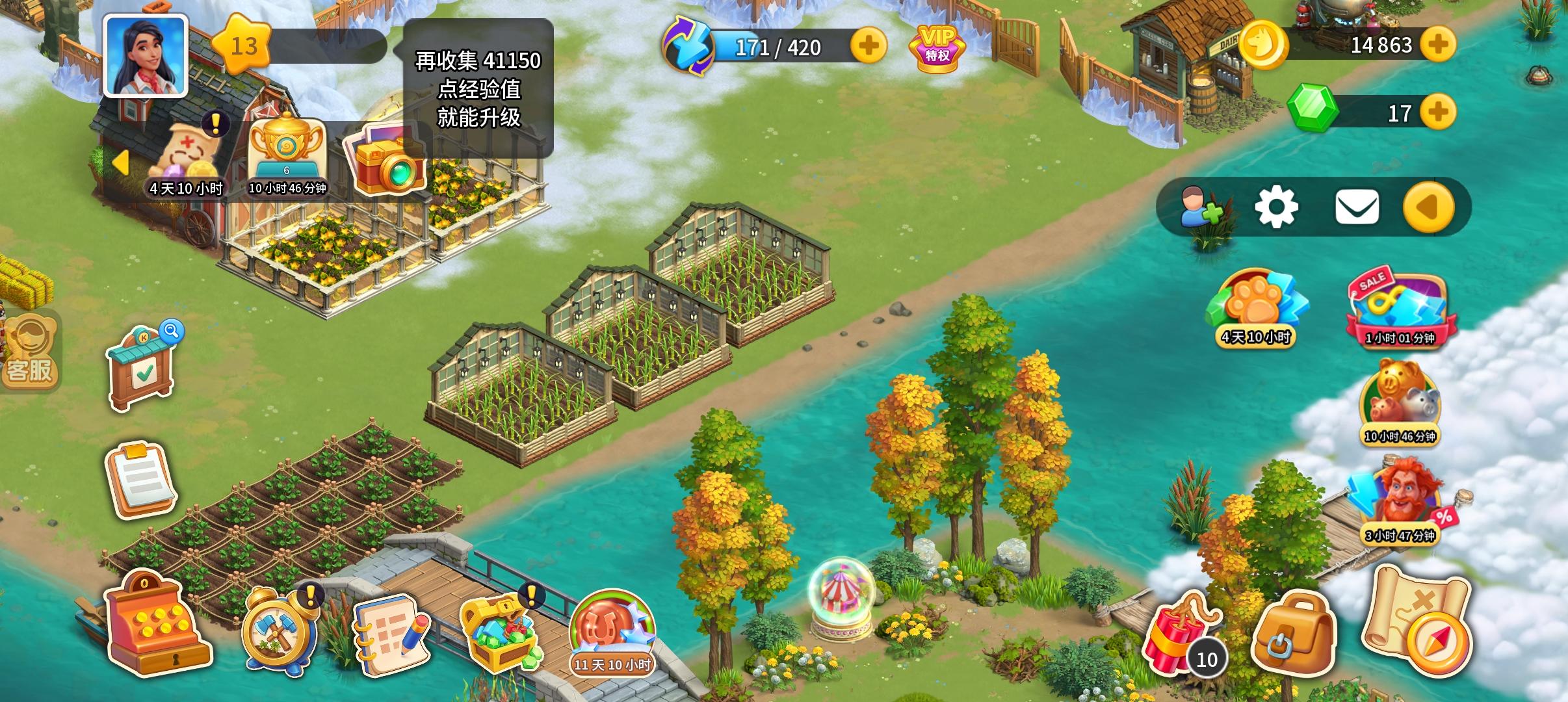 当前地图任务完成之后一定要把有用的资源开采完再去下一个地图,不然地图会在24小时后关闭,云朵遮住的地方尽量打开,然后点图二圈出来的地方,把遮挡的石头树木屏蔽,小箱子小背包都点掉。活动期间主线地图尽量不要去开采,专心肝限时的活动,地图上的能量包(还有礼品盒图五)活动先不要去点,等到地图上出现能耗打折时再去点。还有,12级之后牛奶和鸡蛋就不会缺了。总之这是个需要肝的游戏🤣