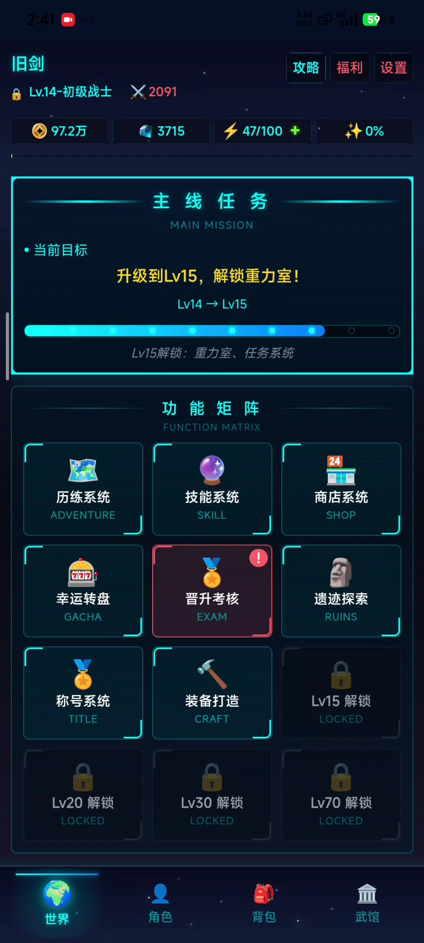 这是我11天的数据前面14级23级31级卡着是因为要考核,战士证明打怪可以掉落,商店每天就3个,体力药剂别用,因为41卡级就要打40级的怪掉战将证明,不然没体力刷,战力的话就抽技能,特别是修炼法,像40级就可以装备A技能,前期就是看广告,抽技能,等40级一身A级技能,至于遗迹是为肝帝准备