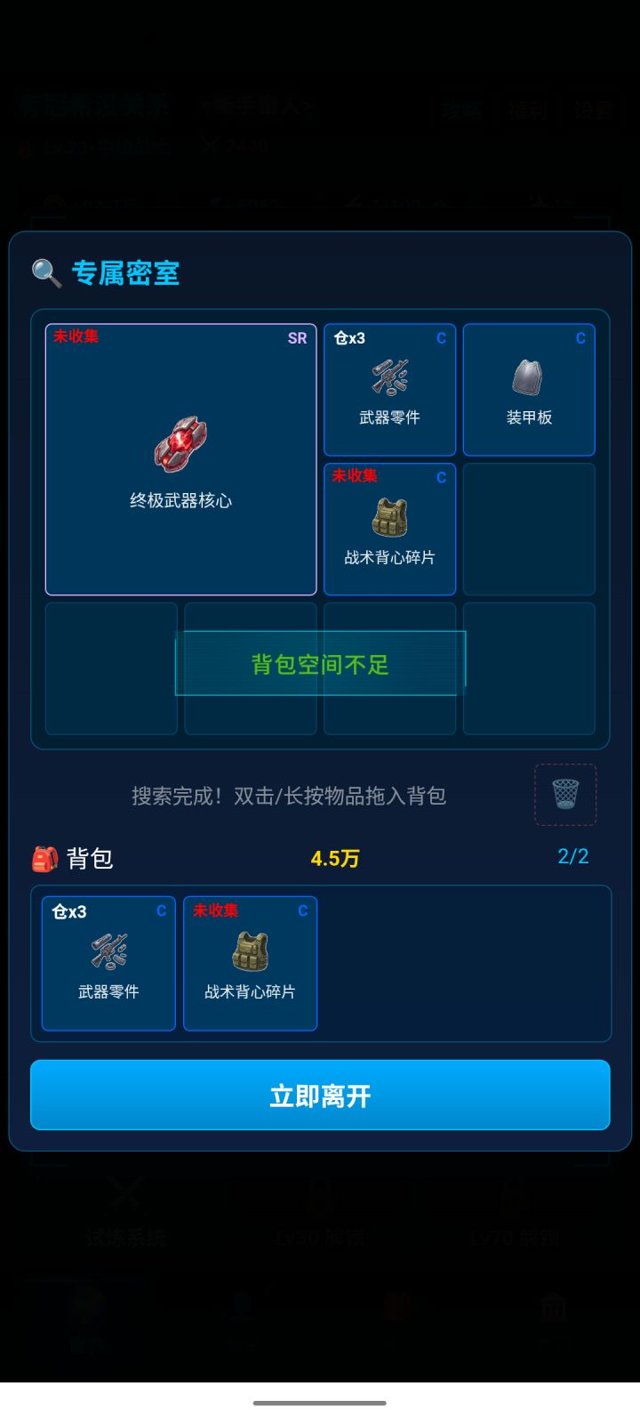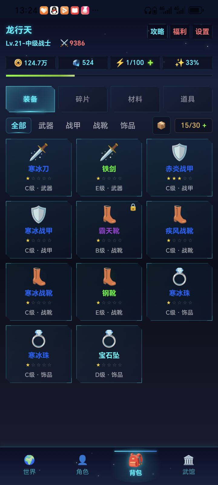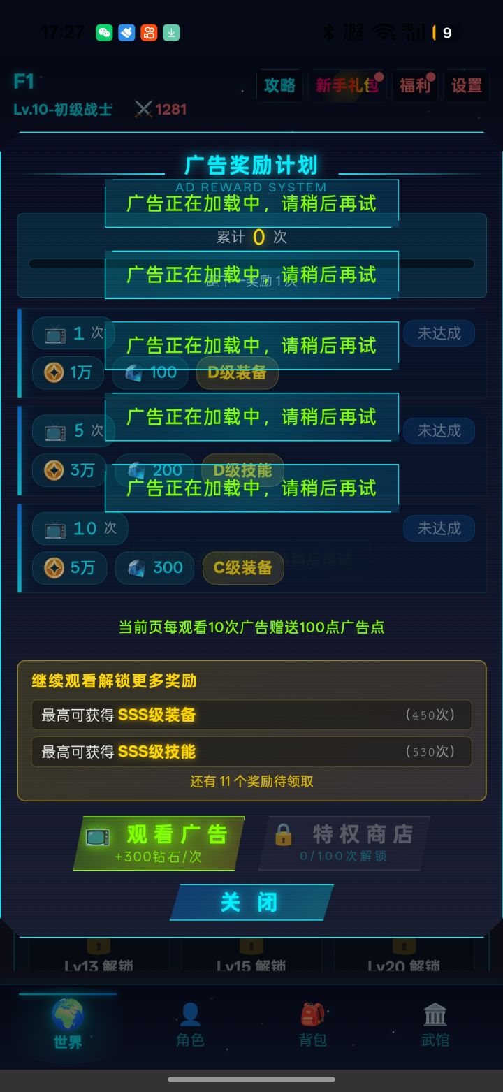广告是一定要看的,一天15个,就当赞助作者了。弄满当前装备和技能就行,其他不要花钻石。两天39级,前面30级基本都是体力连升不会卡,后面需要花体力药剂升级,主要是卡战力了,后面关卡打不过的,不要去打断连胜。