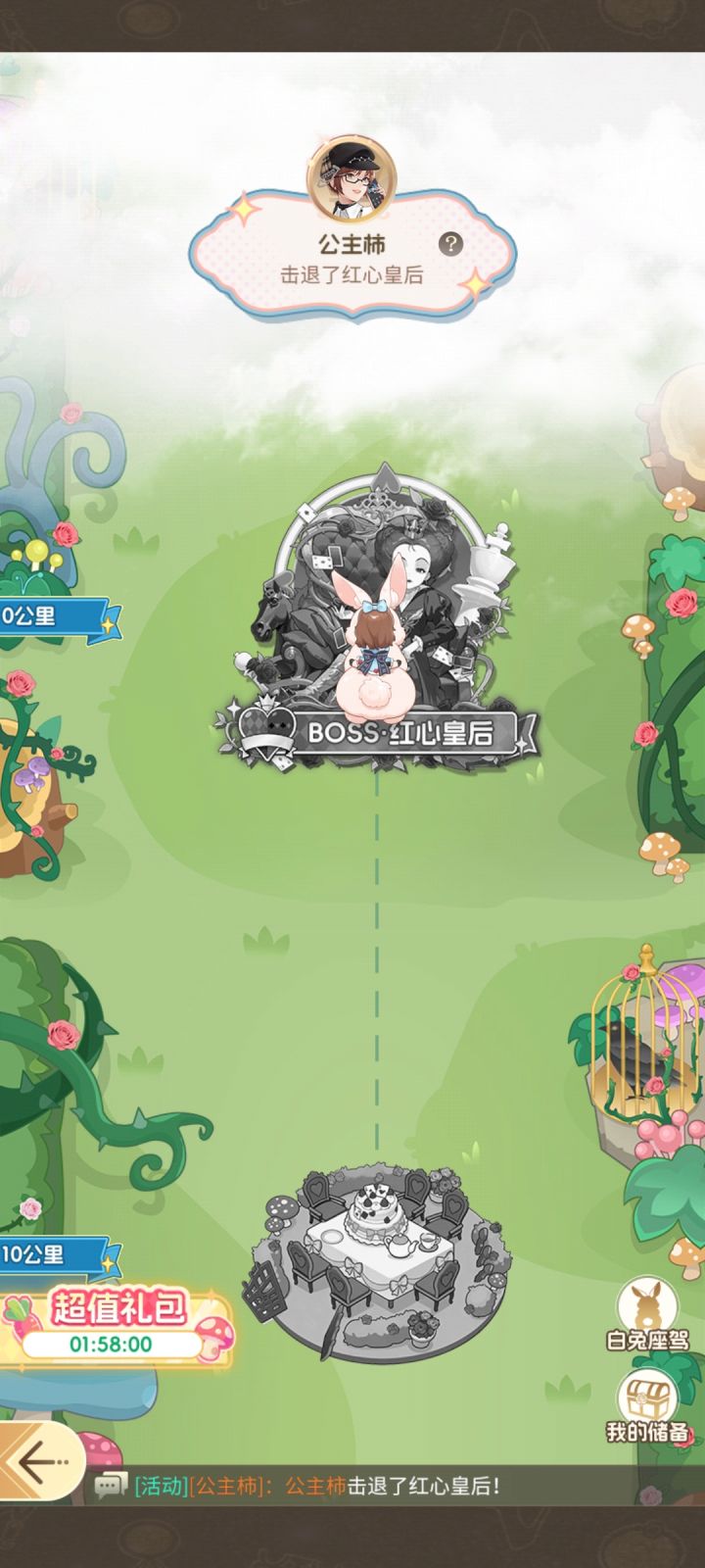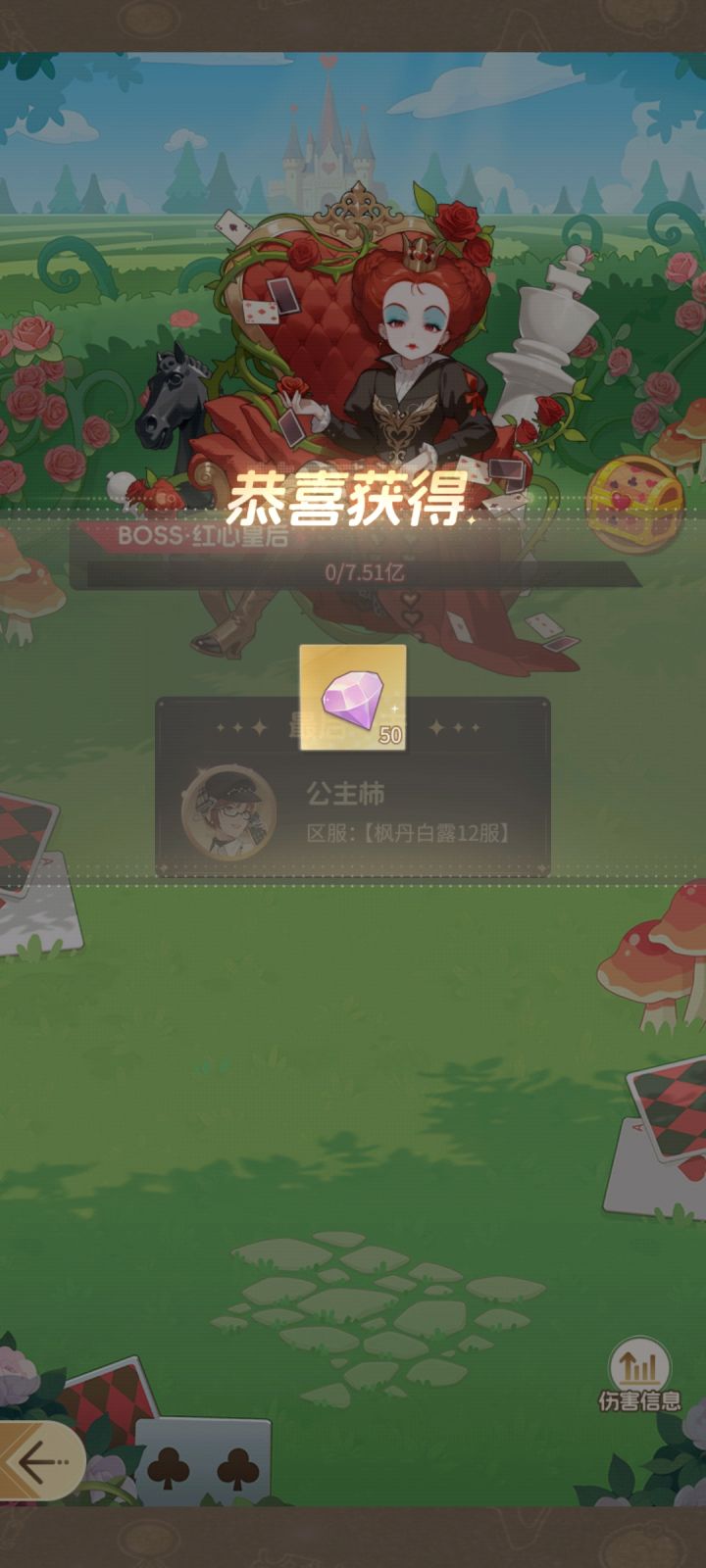 所以……这活动就算结束了嘛??不好意思,刚上线就说红心皇后已出现,赶紧去凑热闹bushi然后我就开始一步一个脚印地苟到前排好家伙,刚一进去才看到红心皇后随手点了个出战,然后……这大boss就被我给秒了最后一击!!诧异之时还想截图来着,可一点击任意处就把奖励图给关了可惜了哈哈好爽好爽哈哈,这奖励拿得可真香啊!!