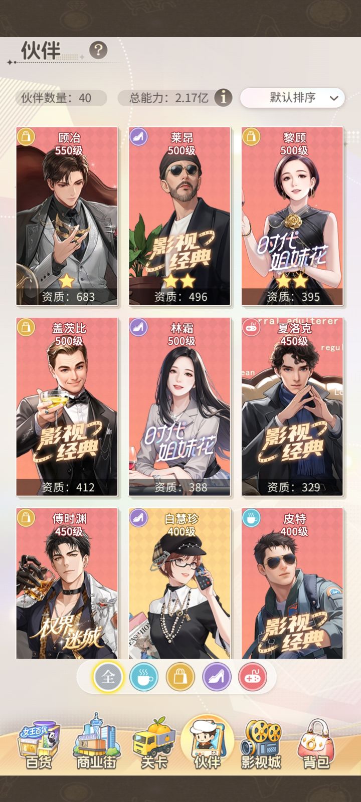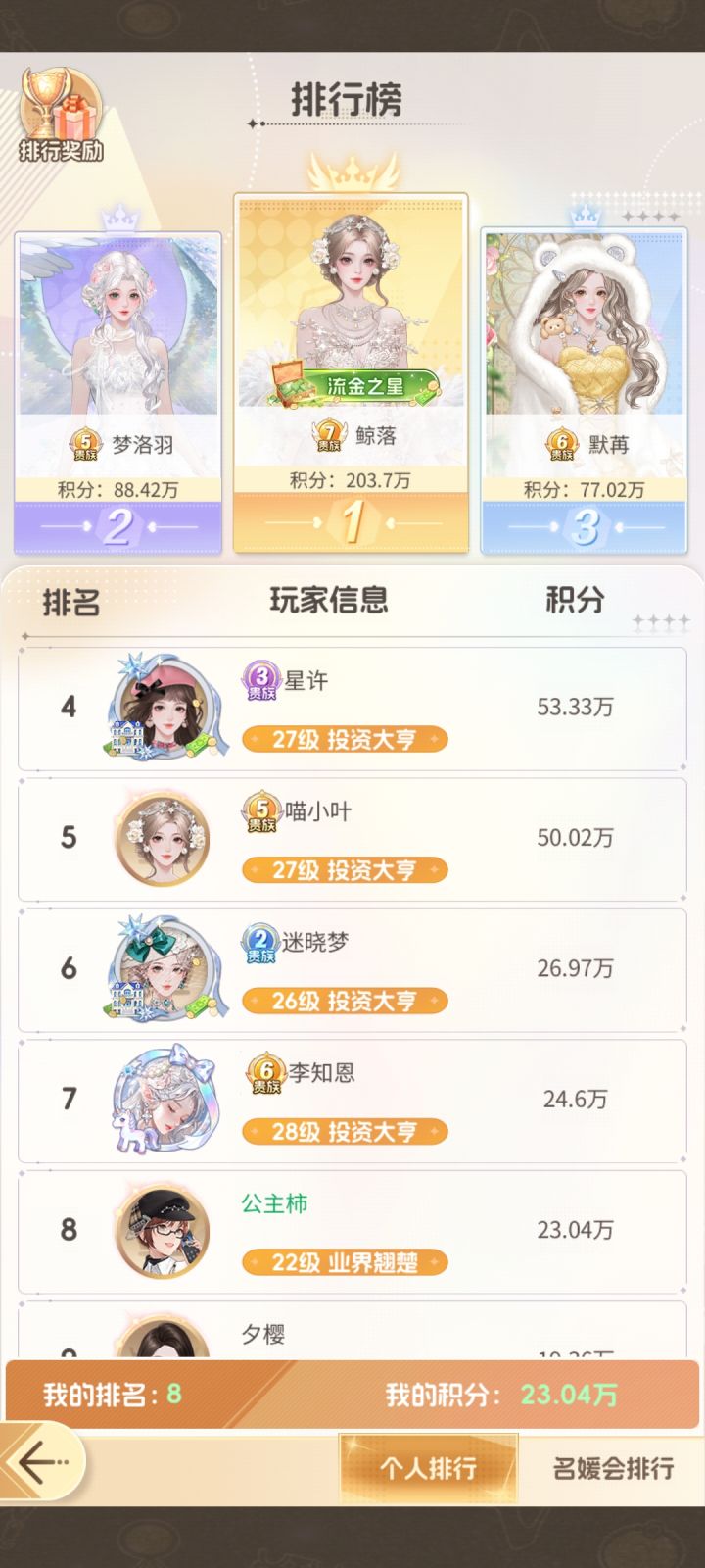 这个游戏很多地方约等于“我本千金”的改良版,比如被牢笼困住,千金里面需要30分钟自动解脱,等那时间,我都把游戏抛之脑后了,而此游里只需要两分钟。又比如名媛会难退的问题,此游几乎是来去自如,而千金里一个月都找不到一次退会机会,人员流动几乎一潭死水。当单机游戏玩还是可以的。最近学到一个道理,热闹意味着容易演变成吵闹,而且维持热闹需要消耗能量,其实真的挺累的。最近进了个新名媛会,压根没有社交,当然排名