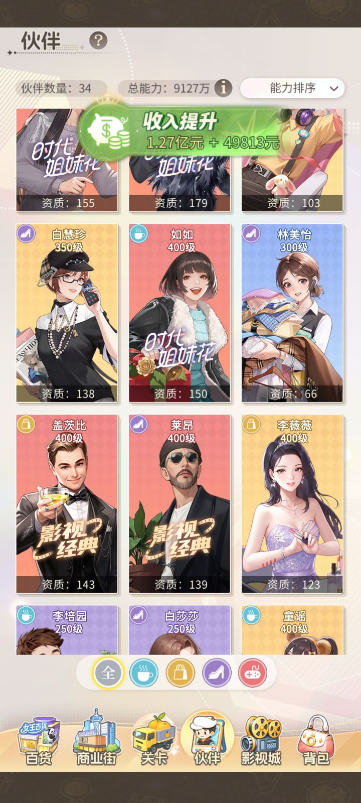 #时尚百货城攻略 看攻略,少走弯路。零氪玩家,我是走了不少弯路才总结的经验,希望对新手有点帮助:1. 上线把所有红点和商业街的活动都过一遍。商战和私人会馆放最后,领完一圈东西,把伙伴升一升再去打。2. 百货城里的生鲜超市、庞物店去进货,电影院去揽客,每隔段时间进去点一下,有上限的。3. 影视城的拍摄、环球差旅也是隔段时间去点一下,不用达到上限就不增了。4. 入个好的名缓会。我入的是服里排
