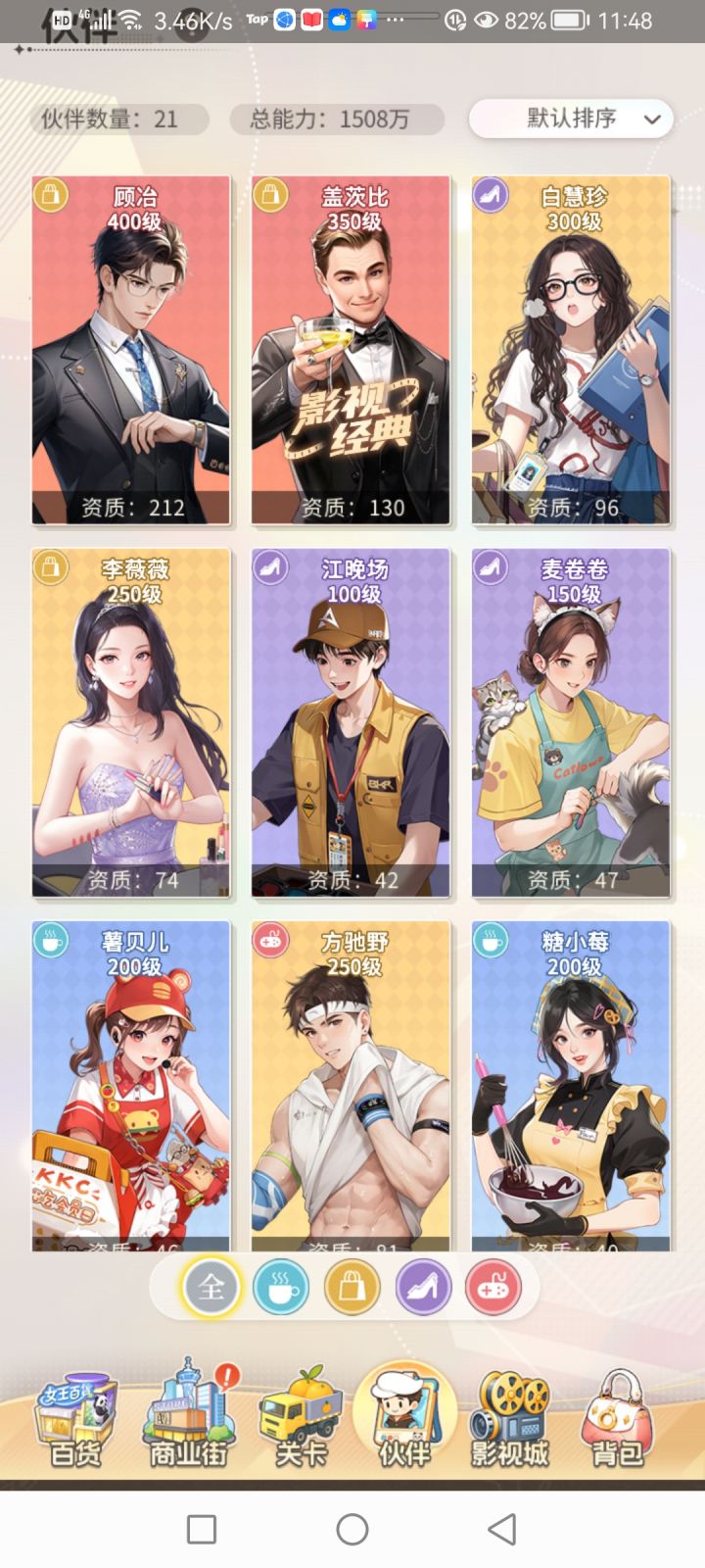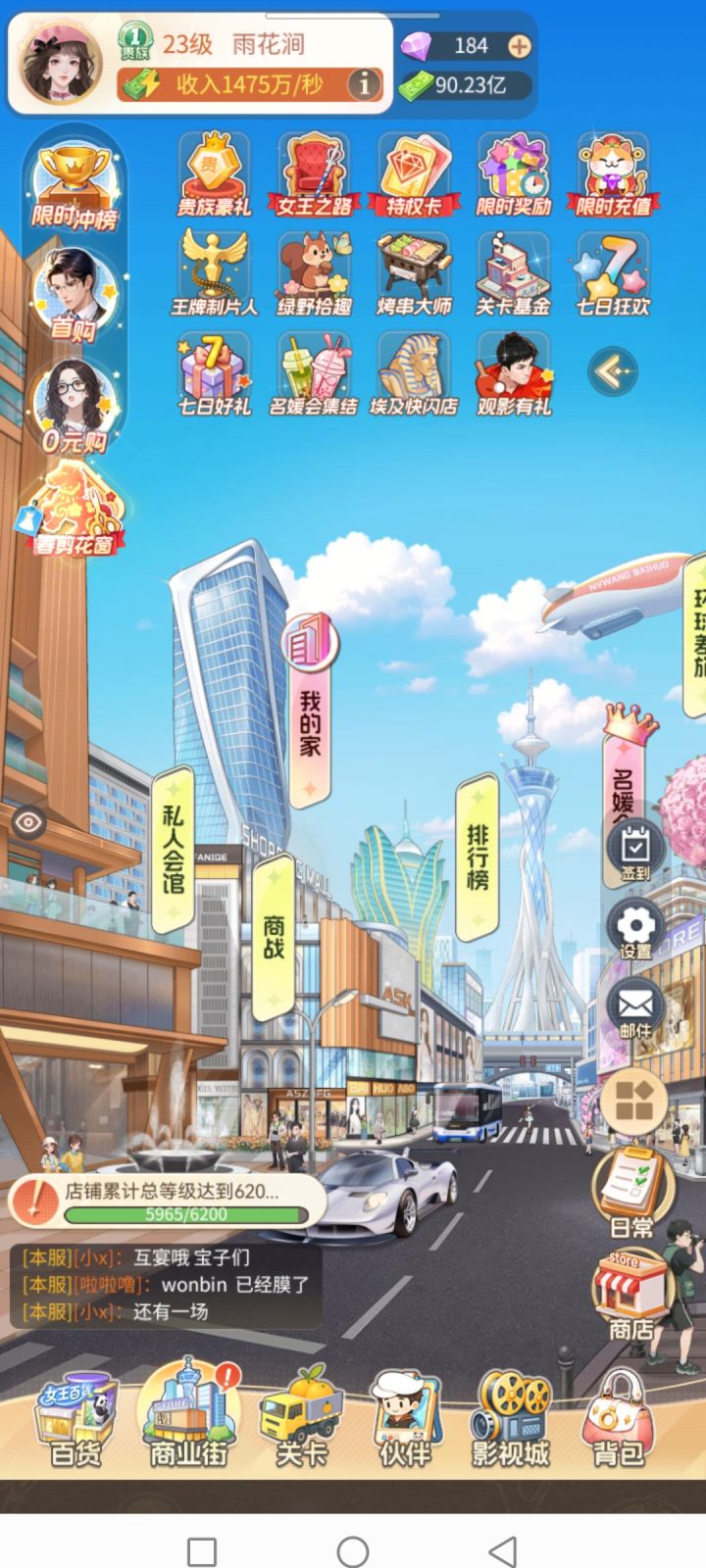 #时尚百货城攻略 看攻略,少走弯路。零氪玩家,我是走了不少弯路才总结的经验,希望对新手有点帮助:1. 上线把所有红点和商业街的活动都过一遍。商战和私人会馆放最后,领完一圈东西,把伙伴升一升再去打。2. 百货城里的生鲜超市、庞物店去进货,电影院去揽客,每隔段时间进去点一下,有上限的。3. 影视城的拍摄、环球差旅也是隔段时间去点一下,不用达到上限就不增了。4. 入个好的名缓会。我入的是服里排