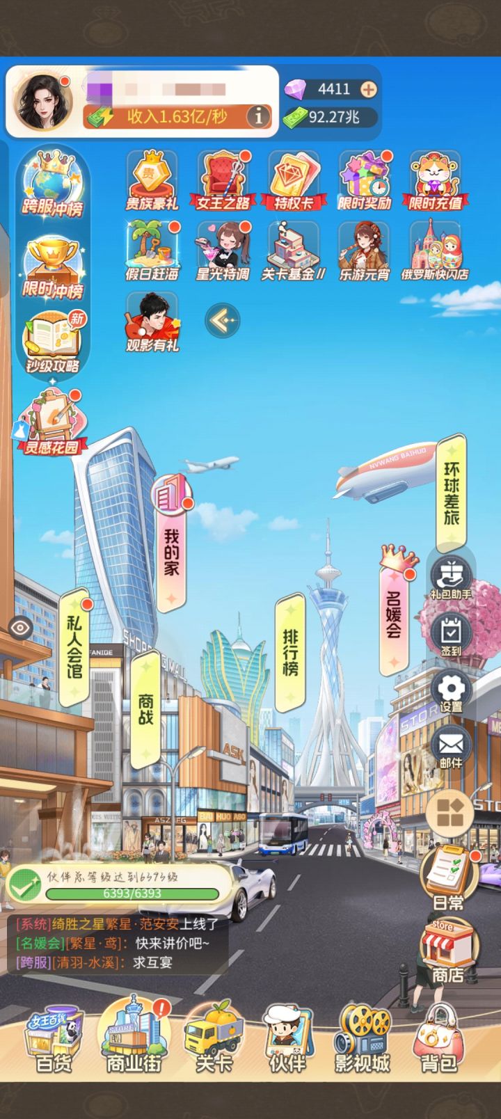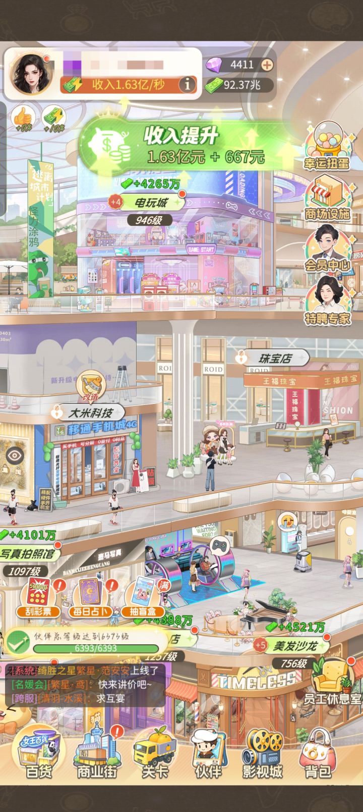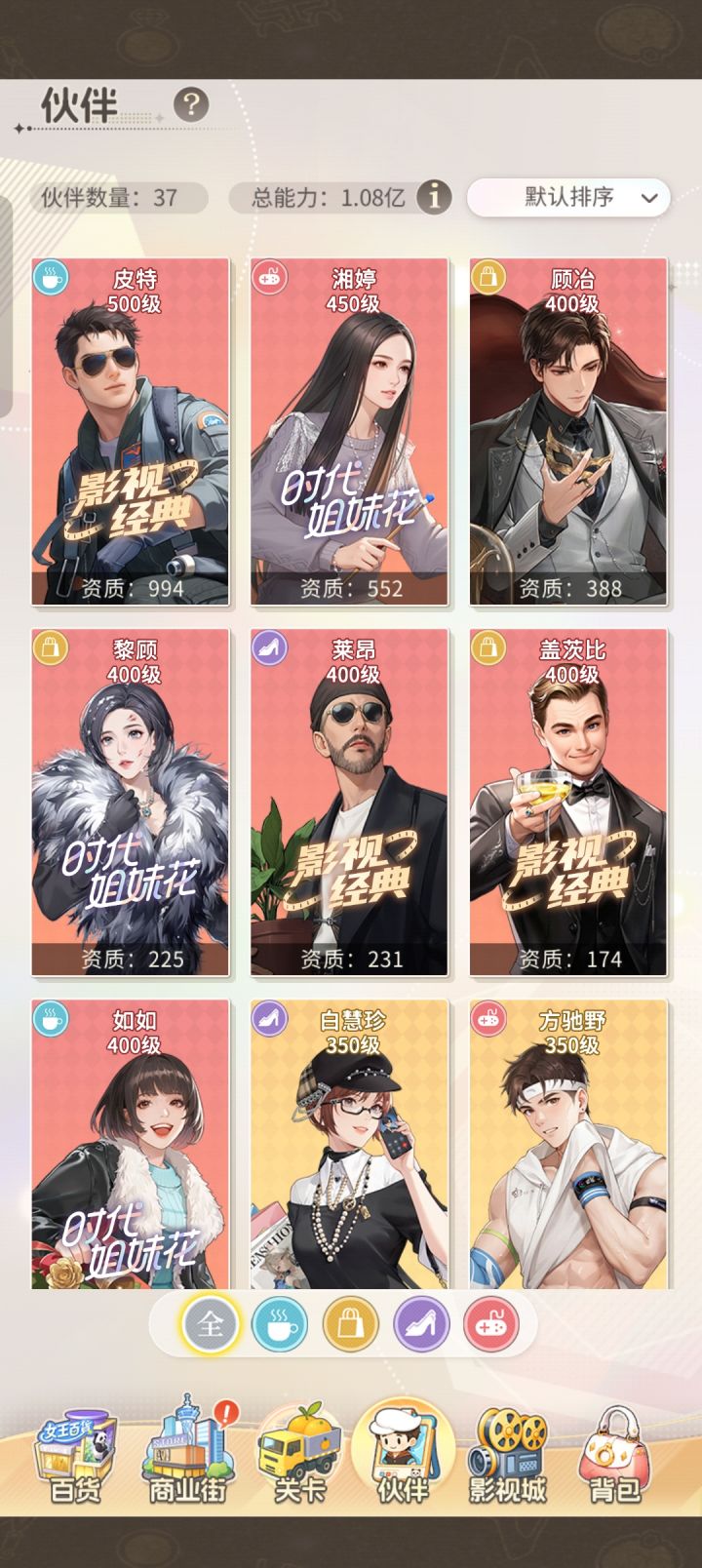 #时尚百货城攻略 看攻略,少走弯路。零氪玩家,我是走了不少弯路才总结的经验,希望对新手有点帮助:1. 上线把所有红点和商业街的活动都过一遍。商战和私人会馆放最后,领完一圈东西,把伙伴升一升再去打。2. 百货城里的生鲜超市、庞物店去进货,电影院去揽客,每隔段时间进去点一下,有上限的。3. 影视城的拍摄、环球差旅也是隔段时间去点一下,不用达到上限就不增了。4. 入个好的名缓会。我入的是服里排