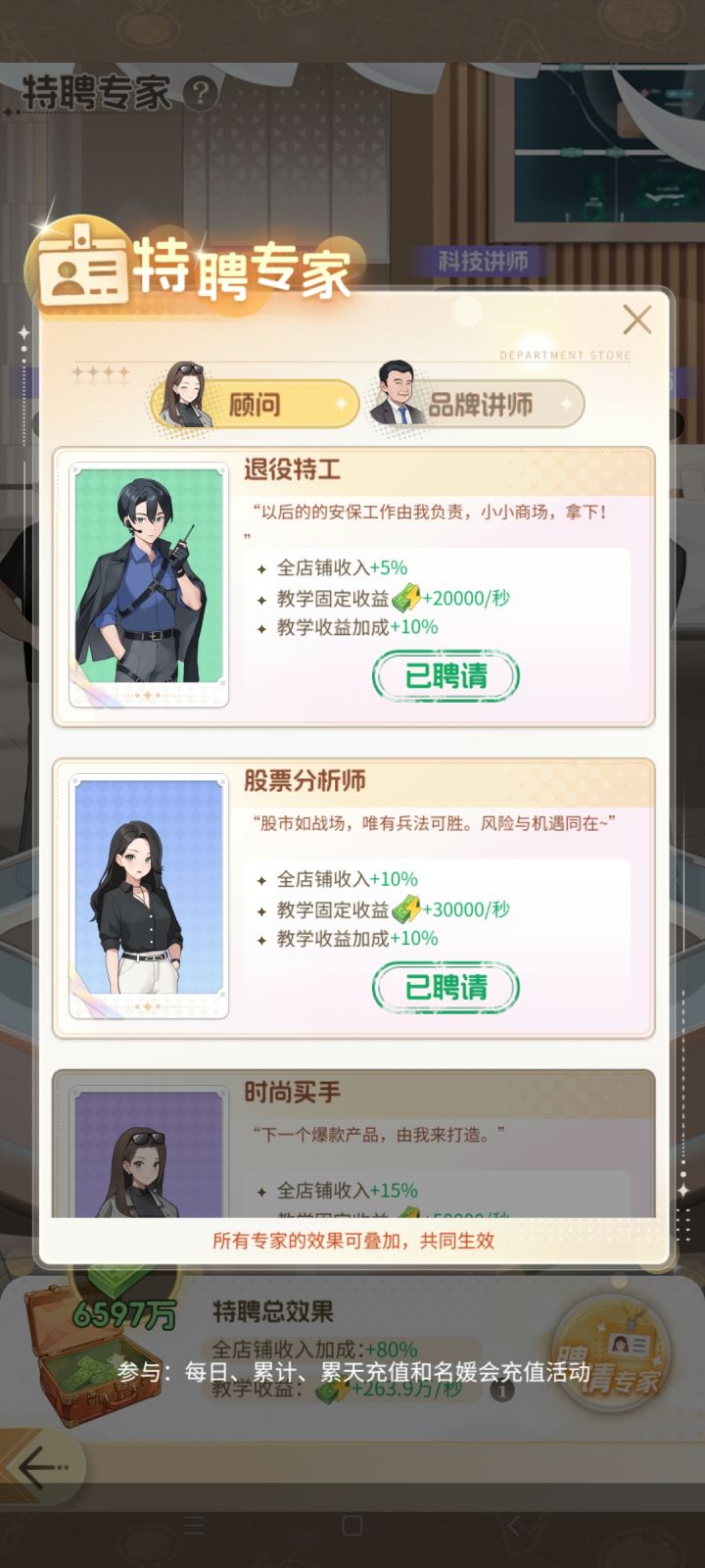 #时尚百货城攻略 看攻略,少走弯路。零氪玩家,我是走了不少弯路才总结的经验,希望对新手有点帮助:1. 上线把所有红点和商业街的活动都过一遍。商战和私人会馆放最后,领完一圈东西,把伙伴升一升再去打。2. 百货城里的生鲜超市、庞物店去进货,电影院去揽客,每隔段时间进去点一下,有上限的。3. 影视城的拍摄、环球差旅也是隔段时间去点一下,不用达到上限就不增了。4. 入个好的名缓会。我入的是服里排