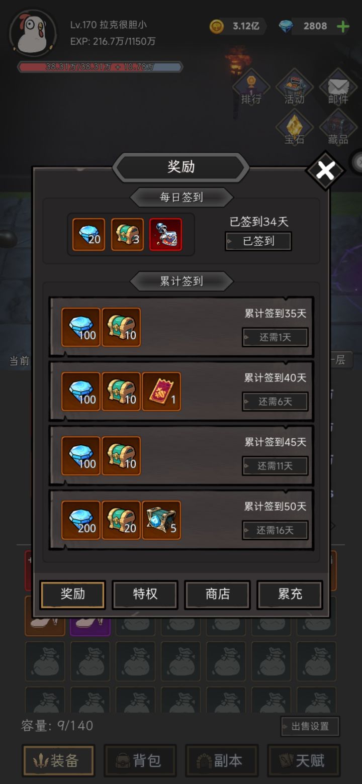 已签到34天,作为一款放置挂机类游戏,非常上头,目前热情不减。简单说下优缺点。