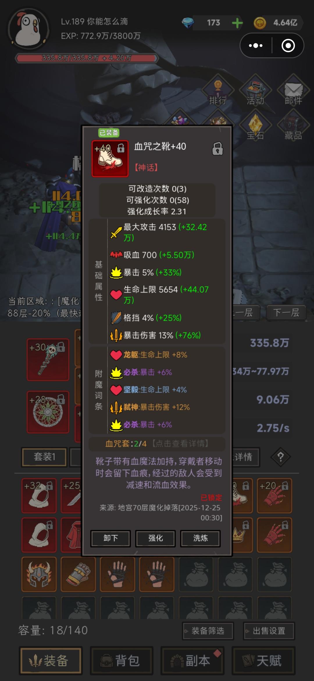 玩这游戏也快一个月了,走过很多弯路,现在给大家分享下,避免步我后尘。 1、59关之前不必要追求套装,因为59关的影舞套能用很久很久,选3件属性好的,67关会爆吸血套,只选2件好属性且不和你速攻套重叠即可。2、88关之前的属性选择,血量>吸血>攻速,洗练优先血量次之暴击( 暴击=暴击伤害的2倍)3、这游戏60关后会出现机制怪,回血怪(需要输出大于回血),输出爆表怪(需要百分百格挡+吸血),速